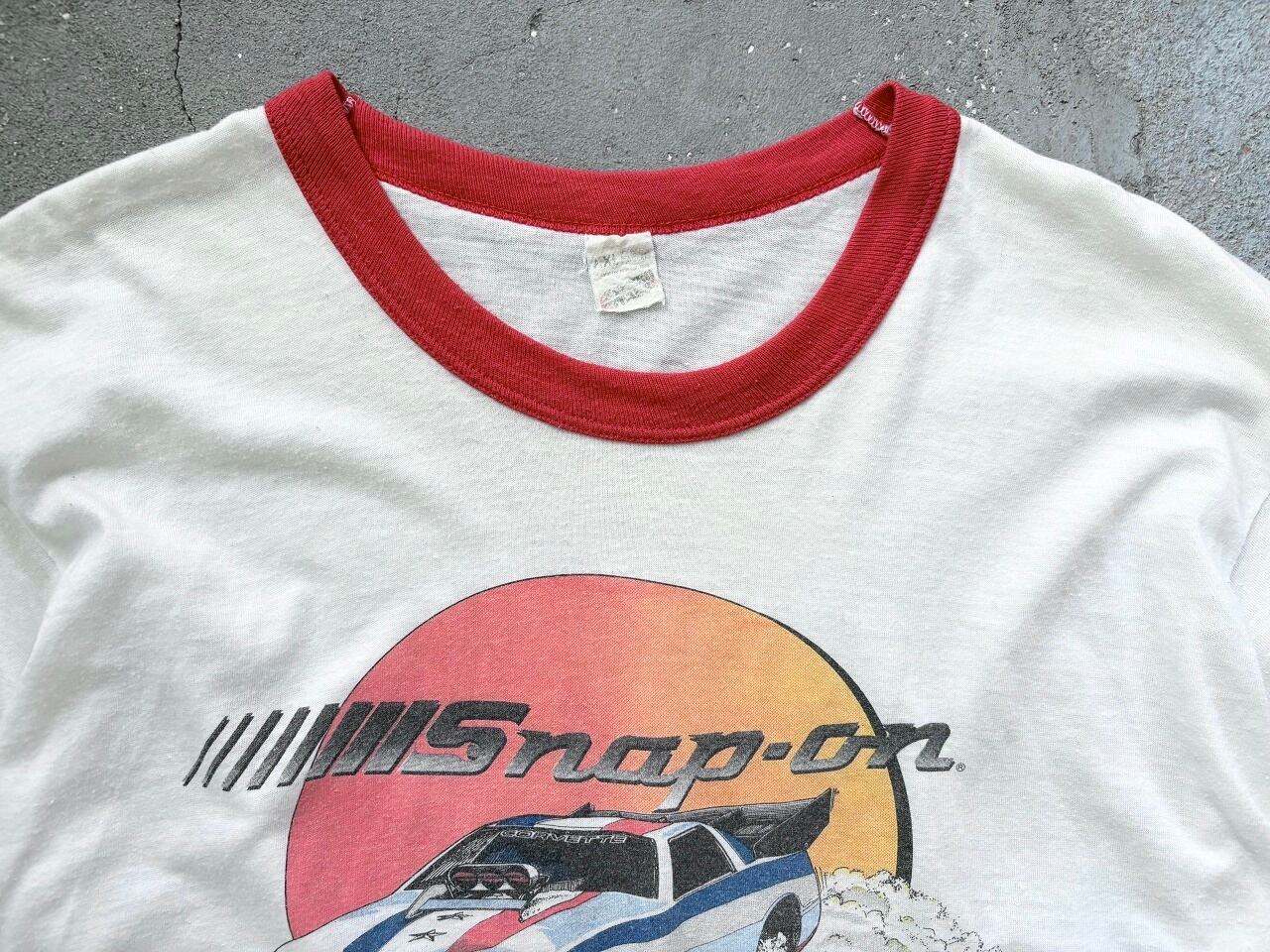 アメリカの老舗工具メーカー"Snap-on"のデザインがプリントされたアメリカンテイスト溢れるTシャツ。ヴィンテージ感のあるスクリーンスターズのボディと赤のトリム、そしてパワフルなコルベットのデザインが雰囲気良くマッチしています。毛玉や黄ばみなど全体的に経年ダメージが見られますが、古き良き味のある一着です。