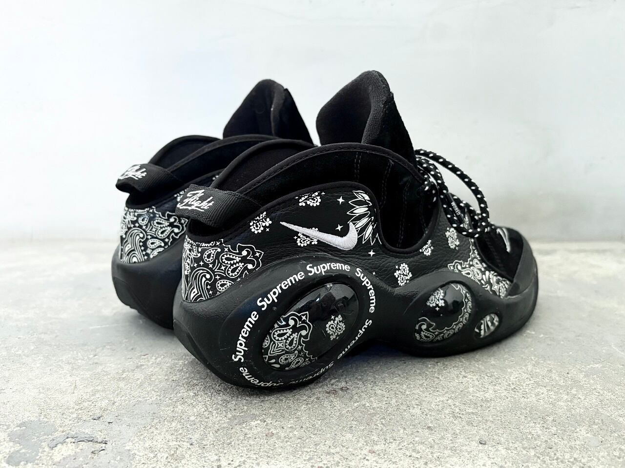 90年代を象徴するハイテク系バスケットシューズ「ZOOM FLIGHT95」をベースに、レザーとスウェードを組み合わせたアッパーやペイズリー柄を落とし込んだクオーターパネル、目玉の愛称で親しまれた"BUG-EYE"をアウトソールに配し、サークル状にシュプリームのロゴを取り入れた秀逸なデザインが特徴的です。斬新なデザインでありながら調和した黒と白で統一感を表現し、洗練された雰囲気を持つ一足です。