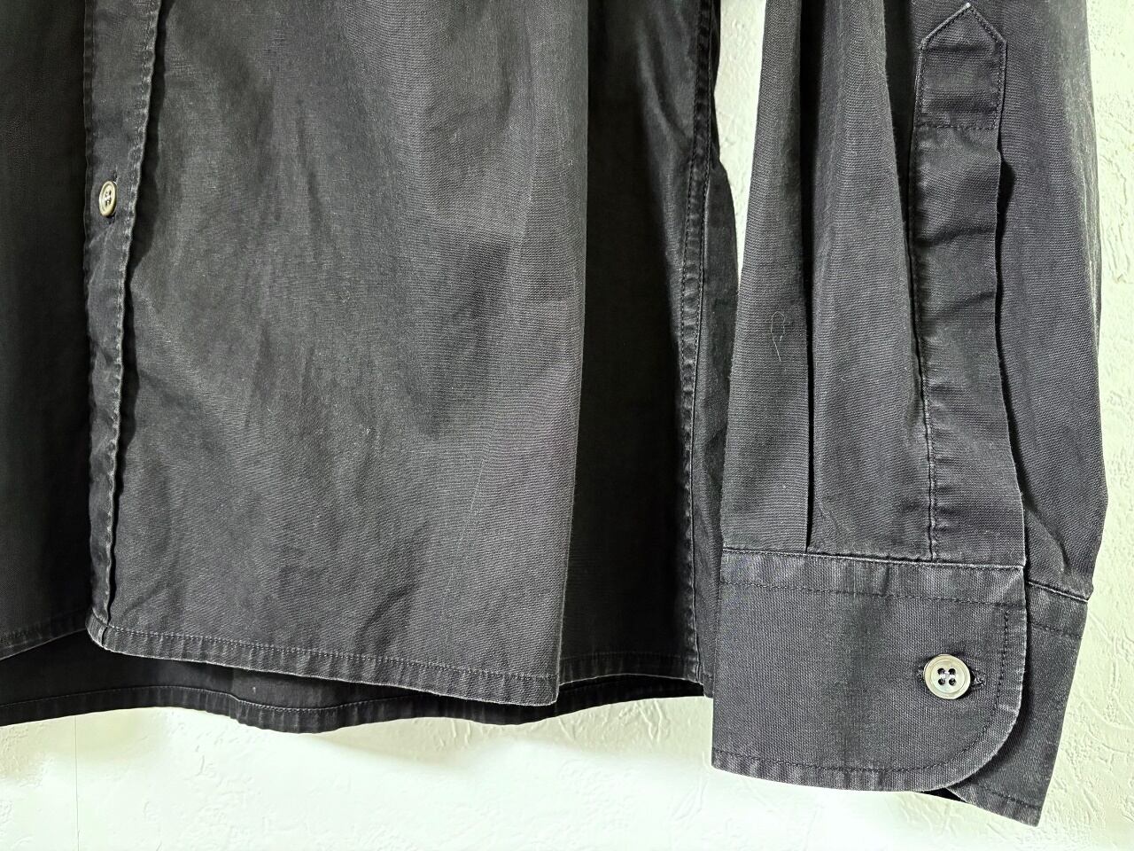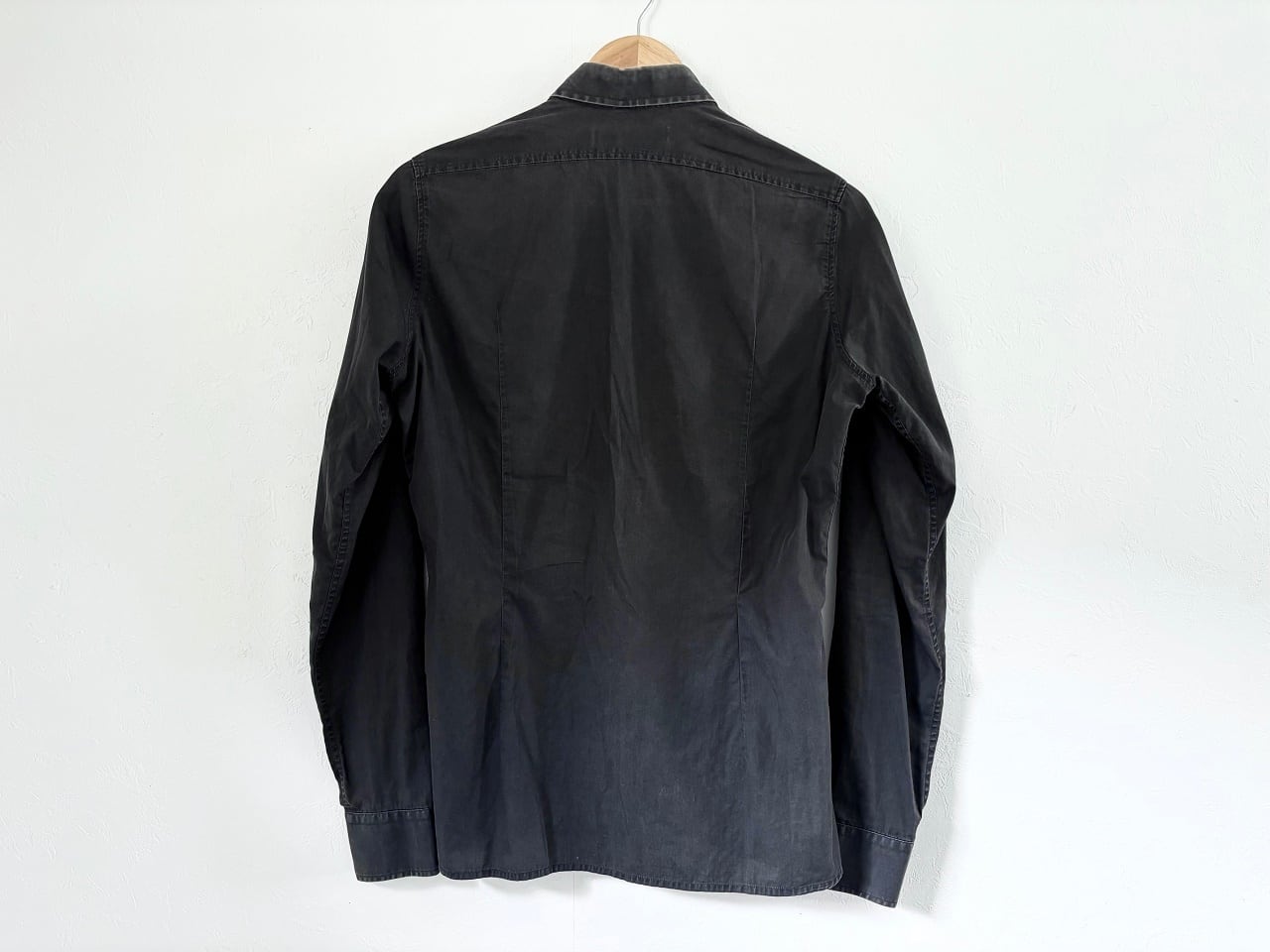 エイジングの効いたコットン生地をベースにワンポイントの刺繍ロゴを配し、前背面ともにプリーツにより絞られたシャープなシルエットが印象的なブラックシャツ。ラフシモンズにとって新たな出発点と評される通称"ポルターガイスト期"のコレクションは、得意とする無駄を省いたミニマルなデザインに加え、黒で統一された極めてモード色の濃い独自の解釈を落とし込んだデザインが特徴的です。2022年にブランド終了を発表したラフシモンズの足跡を辿るアーカイブアイテムです。