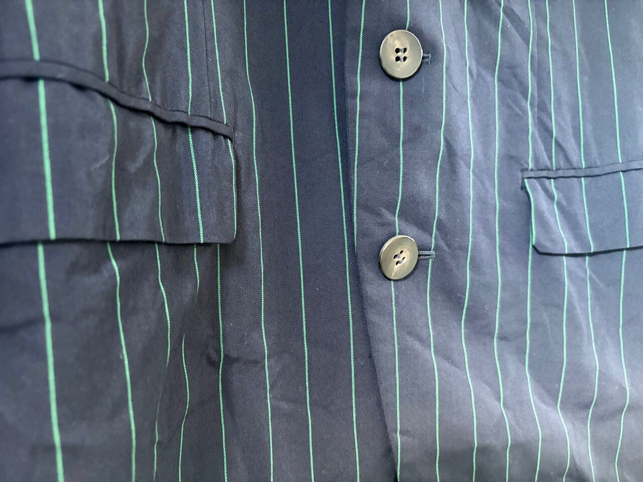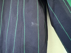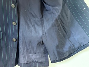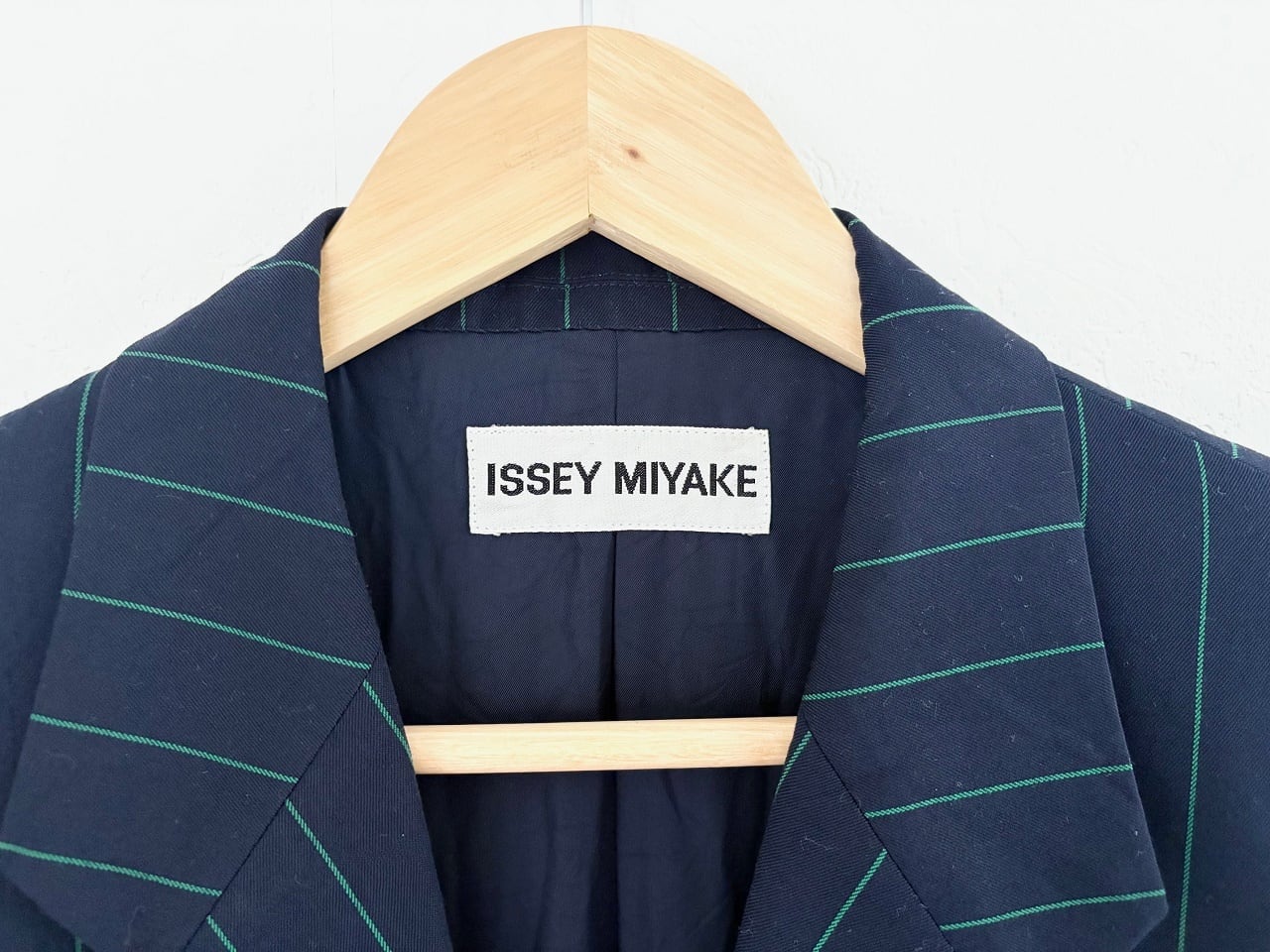 ネイビーにストライプを施したミニマルな配色に加え、袖に大胆なグリーンのアーガイル柄を施した3つボタンジャケット。表地はやや厚みのあるウール100%を使用し、極めてモード色が濃い独創的なデザインの中にもパリのオートクチュールで培った服作りの礎が伺えます。ファッションブランドとしての枠を超え、"東洋の美学"とも評されるイッセイミヤケの革新的な創造性が反映されたアイテムです。