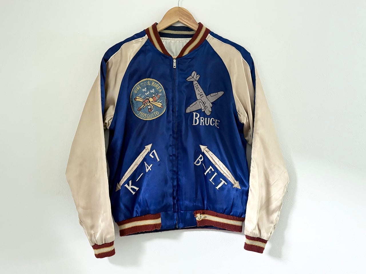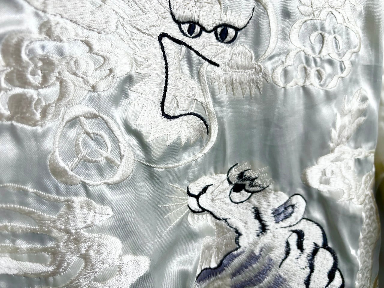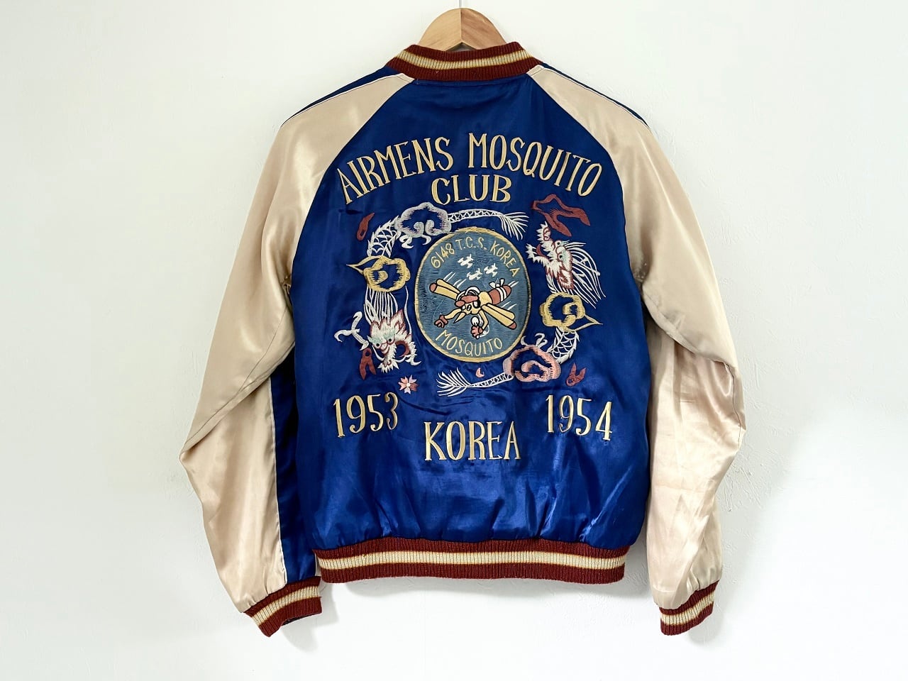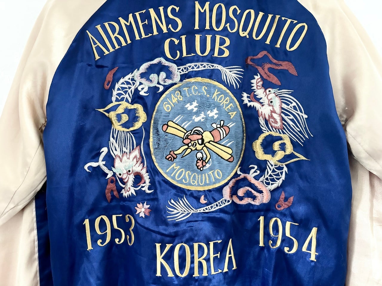 ジャパントラディショナルの豪華な刺繍ワークがインパクトのある横須賀ジャンパー、通称"スカジャン"。和テイストを感じさせるデザインでありながら、米軍兵士のお土産品を起源とする海外へ向けた和洋折衷の独特な雰囲気が魅力。表面は"モスキート部隊"の異名を持つ第6147戦術統制グループの部隊章をモチーフにしたダイナミックな刺繍と、裏面には睨み合う白竜と白虎の迫力あるデザインが施されています。スカジャンは一過性の流行ではなくカルチャーとして現代にも継承され、半世紀以上に渡りスーベニアジャケットを作り続けるテーラー東洋の象徴的なアイテムです。