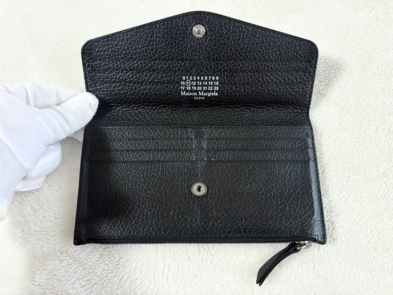 エンボス加工の柔らかなブラックレザーを使用し、マルジェラの象徴的な4ステッチを背面に施したミニマルデザインの長財布。内側には白のカレンダーロゴが記され、厚みがないコンパクトなフォルムでありながらカードケースと余裕のあるコインケースを備えた実用的なディテールが特徴的。上品かつ無駄がなく、マルジェラならではの独創性と洗練されたデザインが魅力のアイテムです。