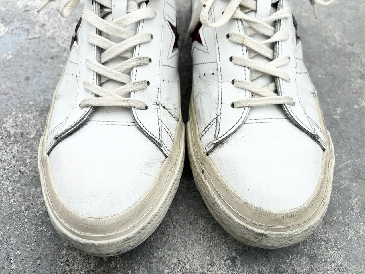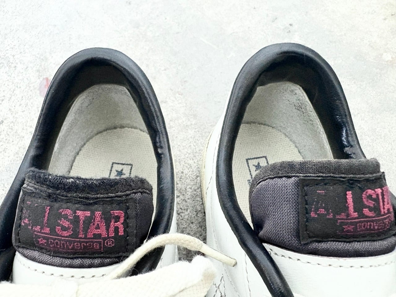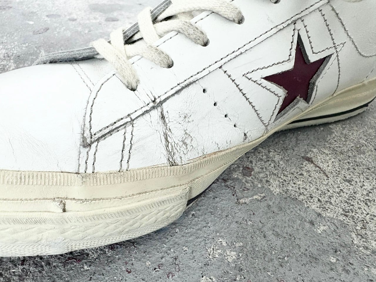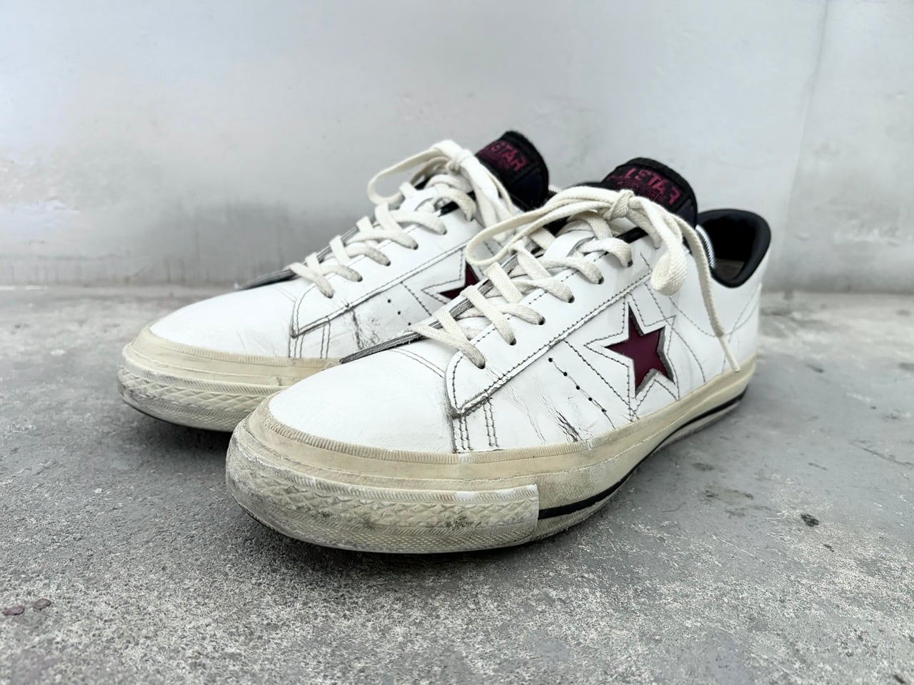 1974年に誕生したコンバースを代表するモデルの一つ"ワンスター"のプレミアムなMADE IN JAPANモデル。白と黒を基調とした光沢のあるレザーをアッパーに使用し、履き込むほどに独特の風合いが増すビンテージ感のある雰囲気が特徴的。シンプルな配色でありながら貫禄のある存在感も魅力の一つです。全体的に経年によるダメージが見られますが、古き良き味のある一足です。