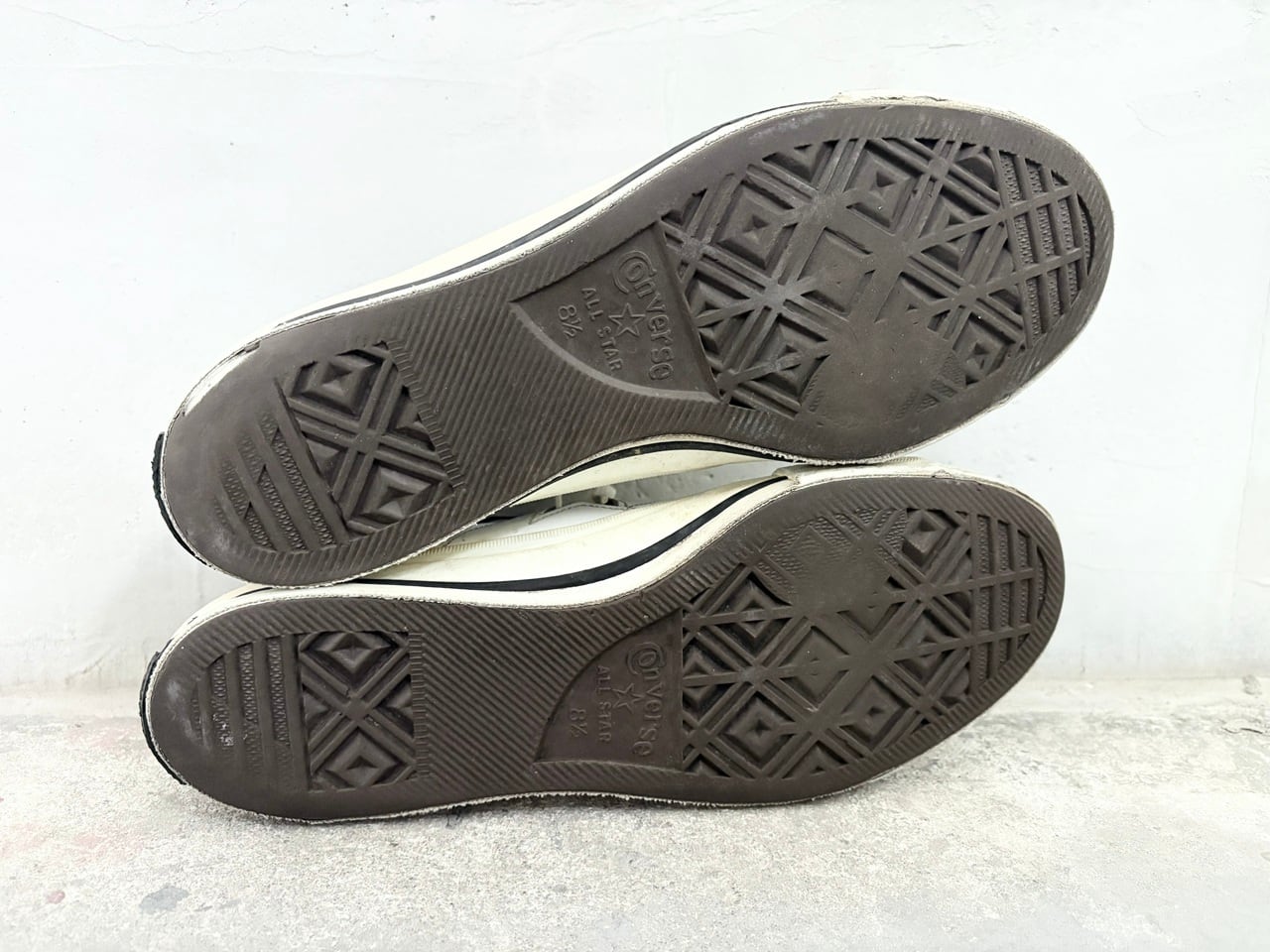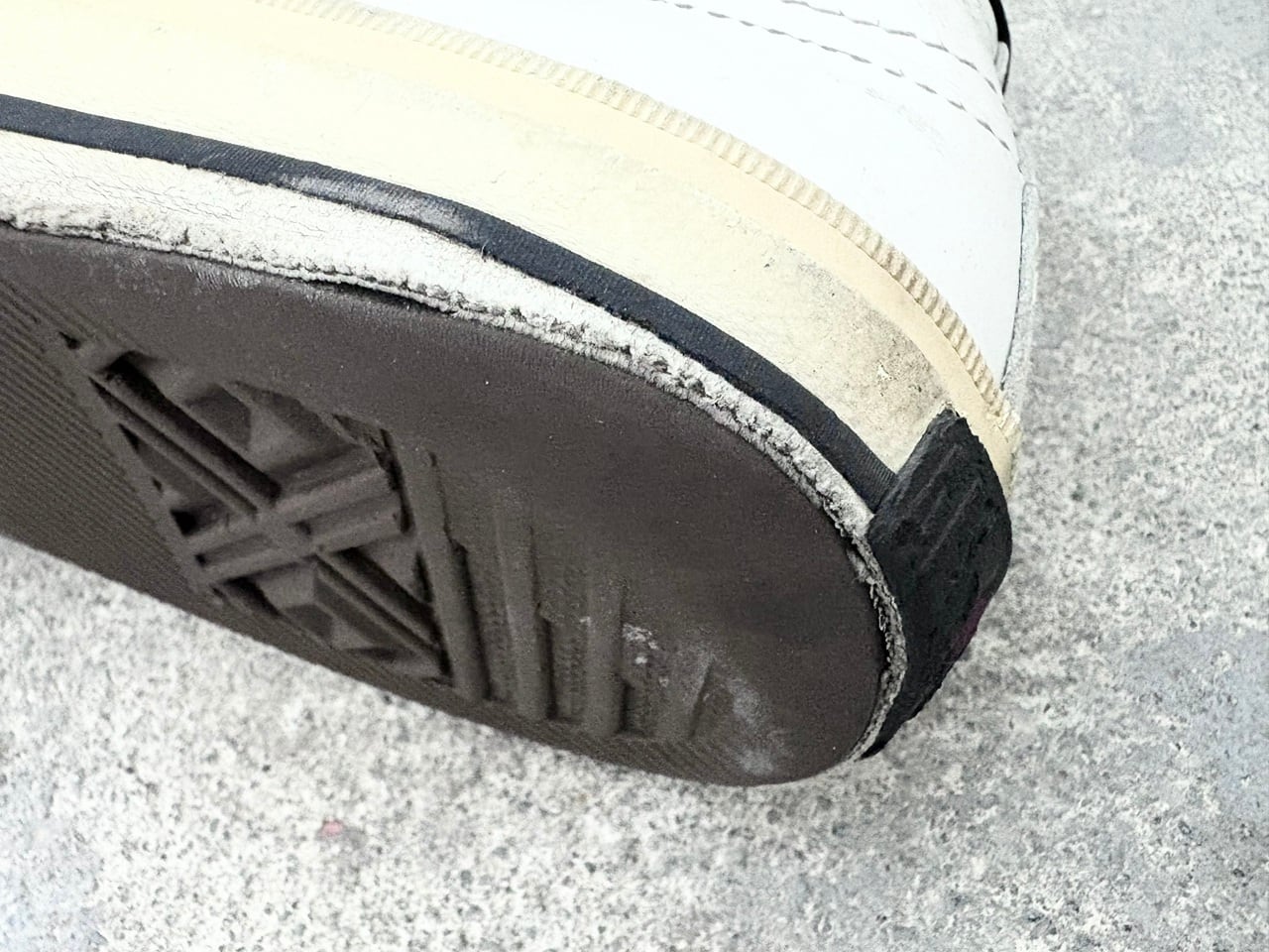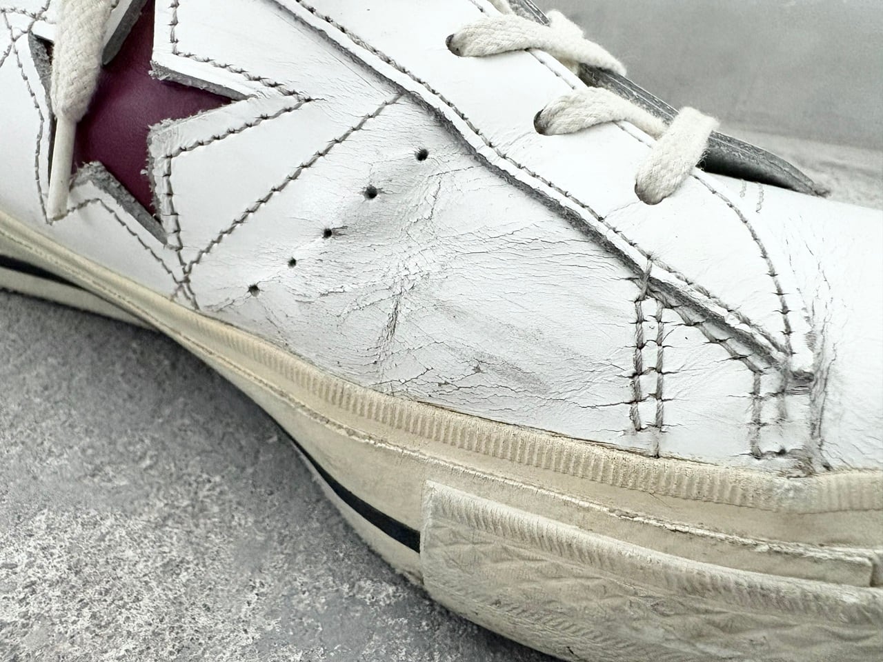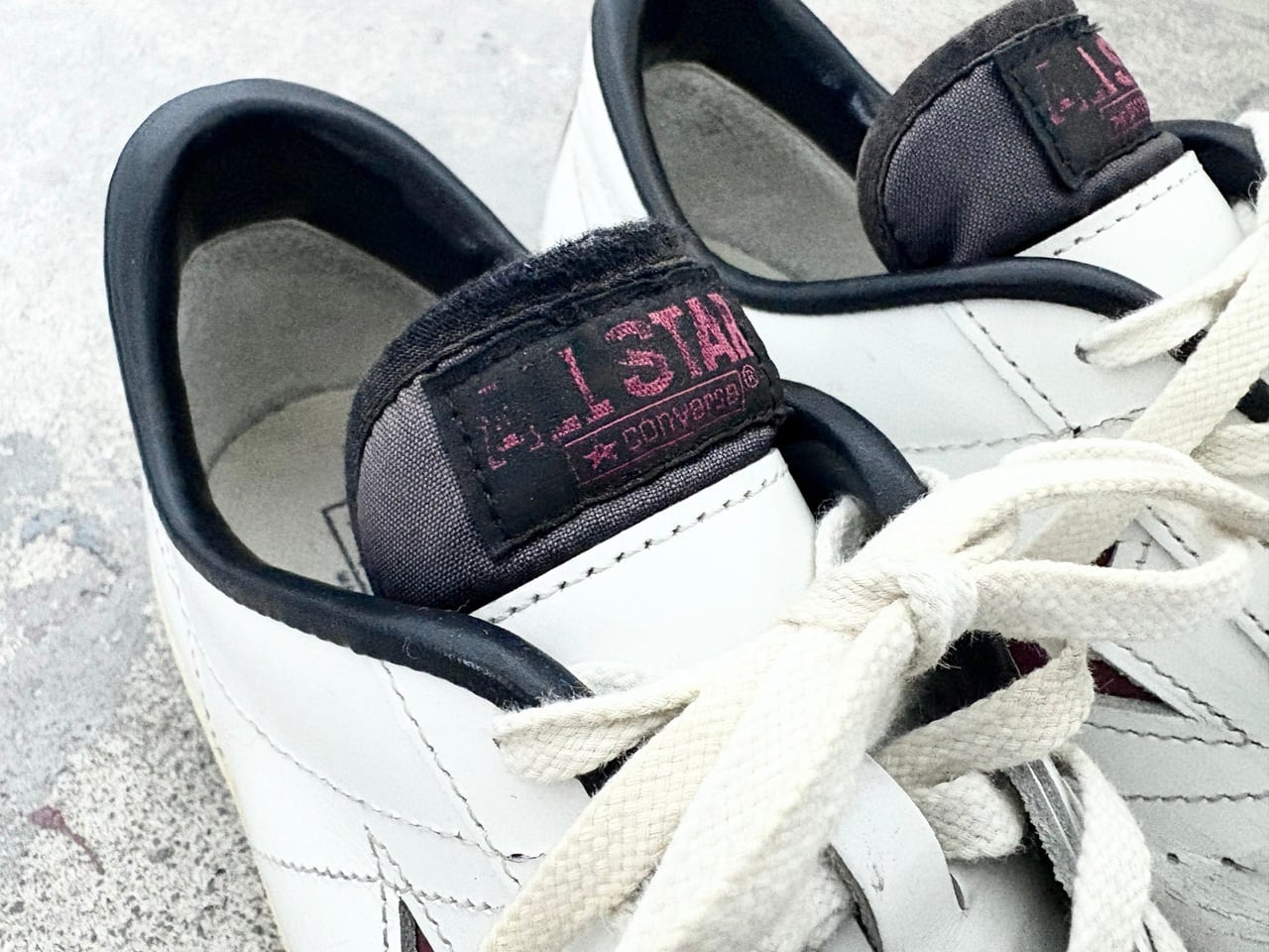 1974年に誕生したコンバースを代表するモデルの一つ"ワンスター"のプレミアムなMADE IN JAPANモデル。白と黒を基調とした光沢のあるレザーをアッパーに使用し、履き込むほどに独特の風合いが増すビンテージ感のある雰囲気が特徴的。シンプルな配色でありながら貫禄のある存在感も魅力の一つです。全体的に経年によるダメージが見られますが、古き良き味のある一足です。