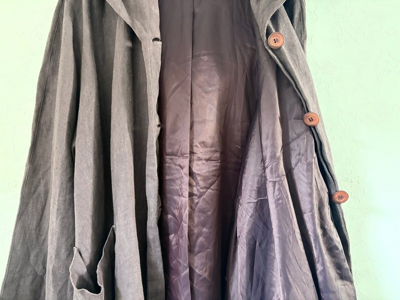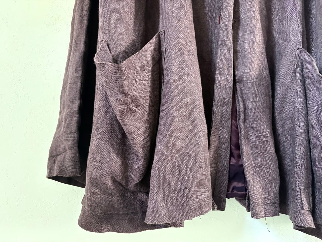 リネンの表地とアセテート・ポリアミドの裏地で構成され、ポンチョのようなオーバーサイズ感と大きめのフードが特徴的なジャケット。リネン特有のざっくりとした質感、そしてグレーとダークレッドの中間色のような色味も含めて、オランダ生まれのブランドらしい独創的な雰囲気が漂っています。デザイン上そでが長いため折り曲げて着用するスタイルも。個性的でありながら、どことなくアルチザンを想起させる素材の特性を活かしたアイテムです。