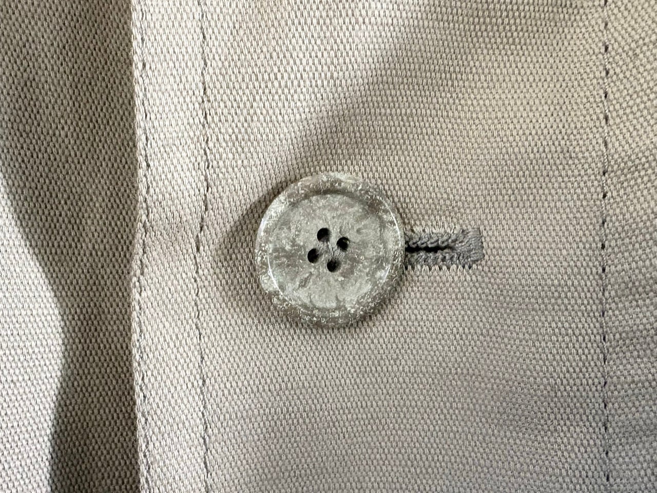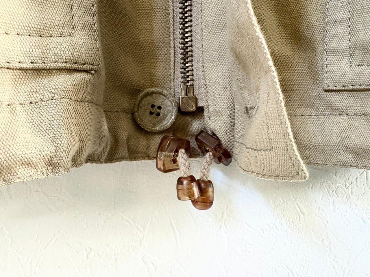 ざっくりとした質感を持つコットン&リネンの混紡素材を使用し、大きめの4ポケットやチンストラップ、絞りのドローコードを備えたミリタリーテイストのジャケット。天然石のような模様のボタンやSALMI製のジッパーを採用するなど、MADE IN AUSTRIAらしいヨーロッパ特有のディテールが特徴的。また、横から手を入れられるフロントポケットも魅力的なポイントの一つ。肌寒い日の重ね着用アウターとして気軽に羽織れるジャケットです。