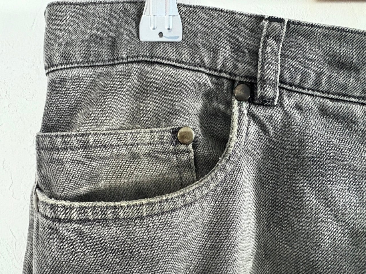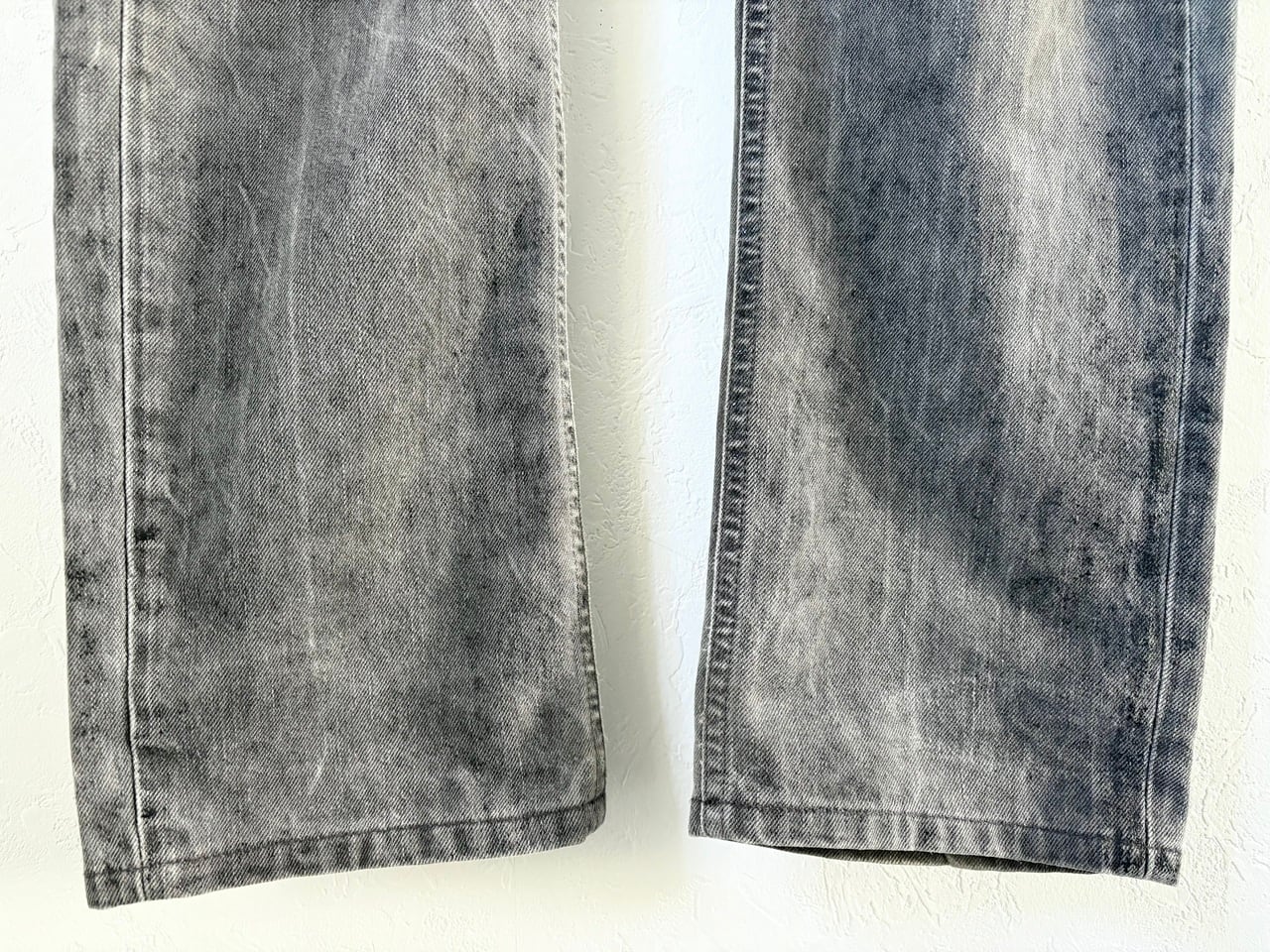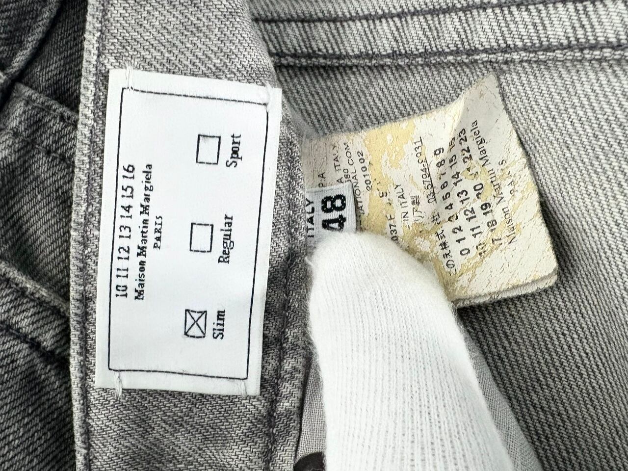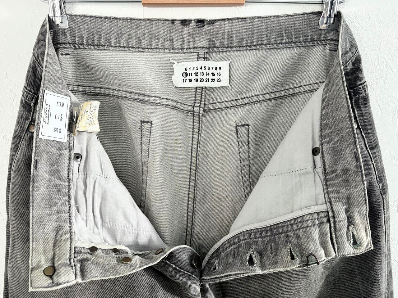 柔らかく肌触りの良いコットン生地を使用し、エイジング感のあるグレーを基調としたスリムシルエットのデニム。所々に擦れたような艶のあるビンテージ加工が施されており、細部のディテールにこだわるマルジェラの世界観が伺えます。ファッション界のカリスマでありながら公に顔を見せることが少なく、ミステリアスな存在として知られるマルタン・マルジェラ氏は、時代の先を行く前衛的かつ斬新なデザインでファッション界にとどまらず多岐の分野に渡って影響を与えています。一部汚れやタグの劣化が見られますが、デザイン哲学がより濃く反映されたMaison Martin Margiela表記のここのえタグ。"着る現代アート"とも称されるマルジェラの足跡を辿るアーカイブアイテムです。