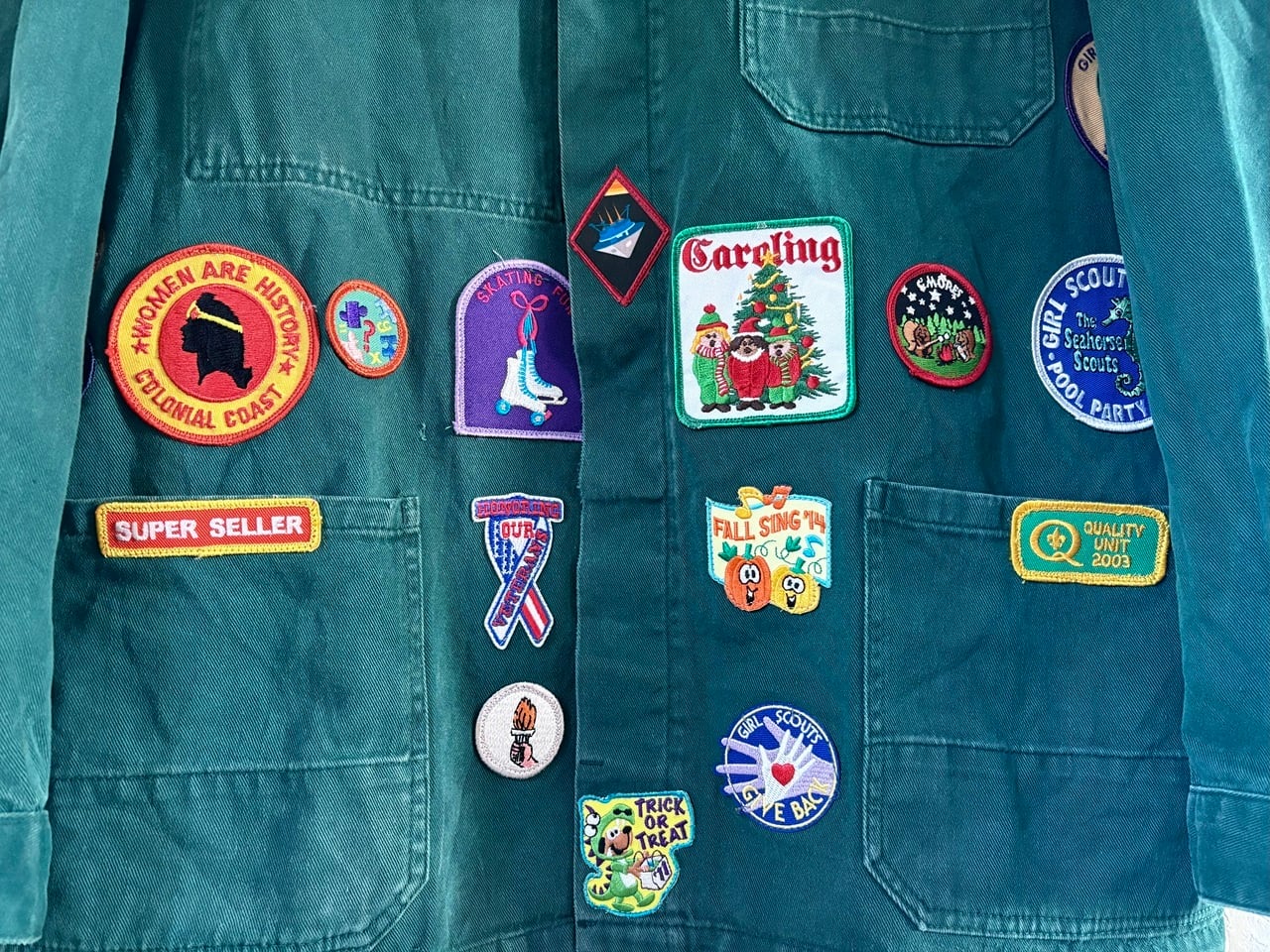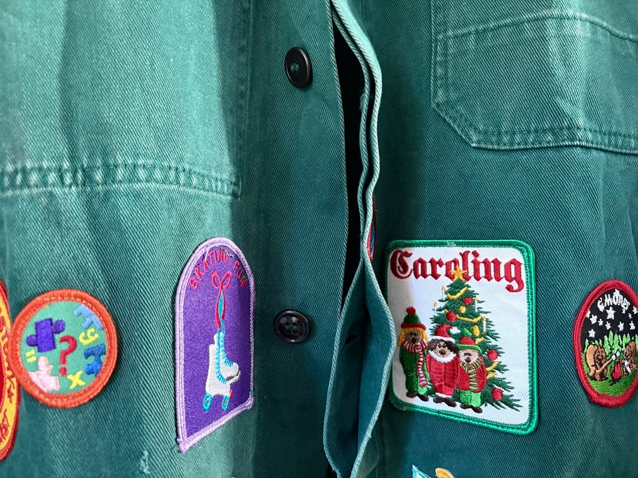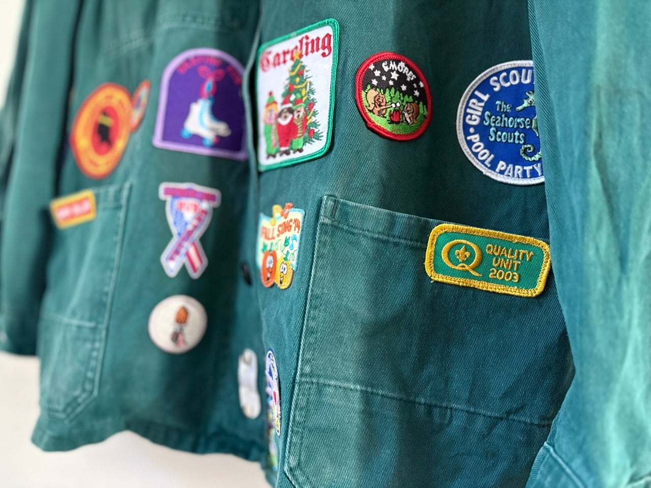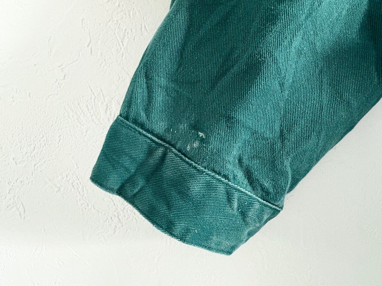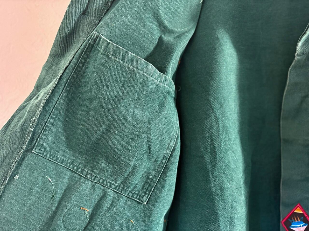 味のあるヴィンテージ古着のアトリエジャケットをベースに、フランスでリメイクが施された一点物のアイテム。前面に配された大きさや形状が異なる様々なワッペンは、経年により生み出されたナチュラルなダメージと風合いを持つアトリエジャケット特有の雰囲気と相性良くマッチしています。ちょっと珍しいグリーンカラーもポイントで、経年変化もデザインの一部として溶け込むアーティスティックなジャケットです。