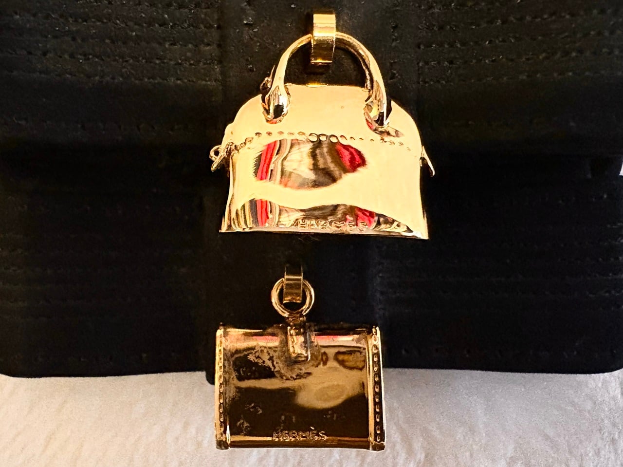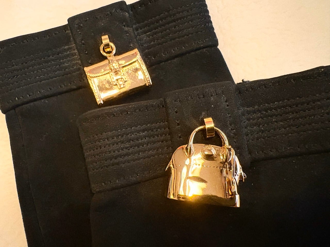 シックで高級感のあるブラックスエードレザーを使用し、甲部分にエルメスのアイコニックなチャームが上品に添えられたレザー手袋。そのモチーフとなるボリードのハンドバッグとジジェのクラッチバックは、エルメスを象徴するアイテムの一つとして時代を超えて長年愛され続け、気品があり優雅な手袋にそのエッセンスを織り込むことでエルメスの持つ世界観がより深く表現されています。装飾の繊細さとしなやかな革の風合い、そしてエルメスならではのエレガンスな雰囲気が漂うアイテムです。