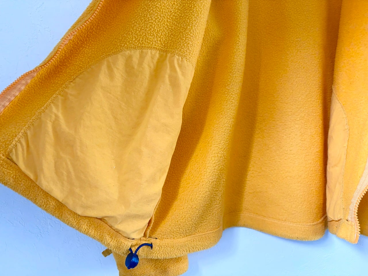 軽やかなポリエステル素材を使用し、アクセントの効いたイエローカラーが印象的なフリースジャケット。ジッパー付きフロントポケットと裾部にはドローコードを備え、その作りは古き良きMADE IN USA。タウンユースやアウトドアシーンなど、肌寒い日に気軽に羽織れるフリースジャケットです。