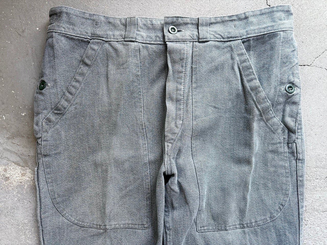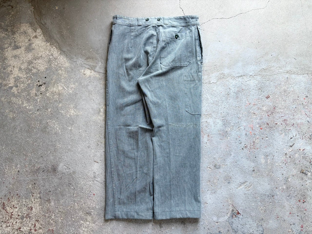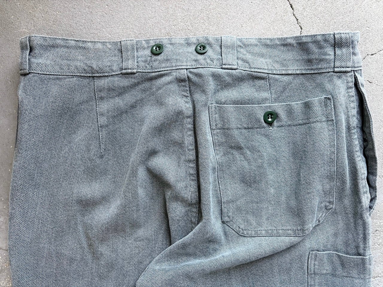 ブランドタグがなく年代等の詳細は不明ですが、やや起毛感のあるコットンツイル生地を使用し、サスペンダーボタンや貫通ポケットを備えたクラシックなディテールが特徴的な一着。フロントはボタンフライでツールポケットが施されたワークパンツのような雰囲気を持ちながら、どことなくミリタリーテイストを感じる独特の雰囲気を放っています。武骨な印象が強すぎず、落ち着きのある大人カジュアルなコーディネートとも相性が良いアイテムです。