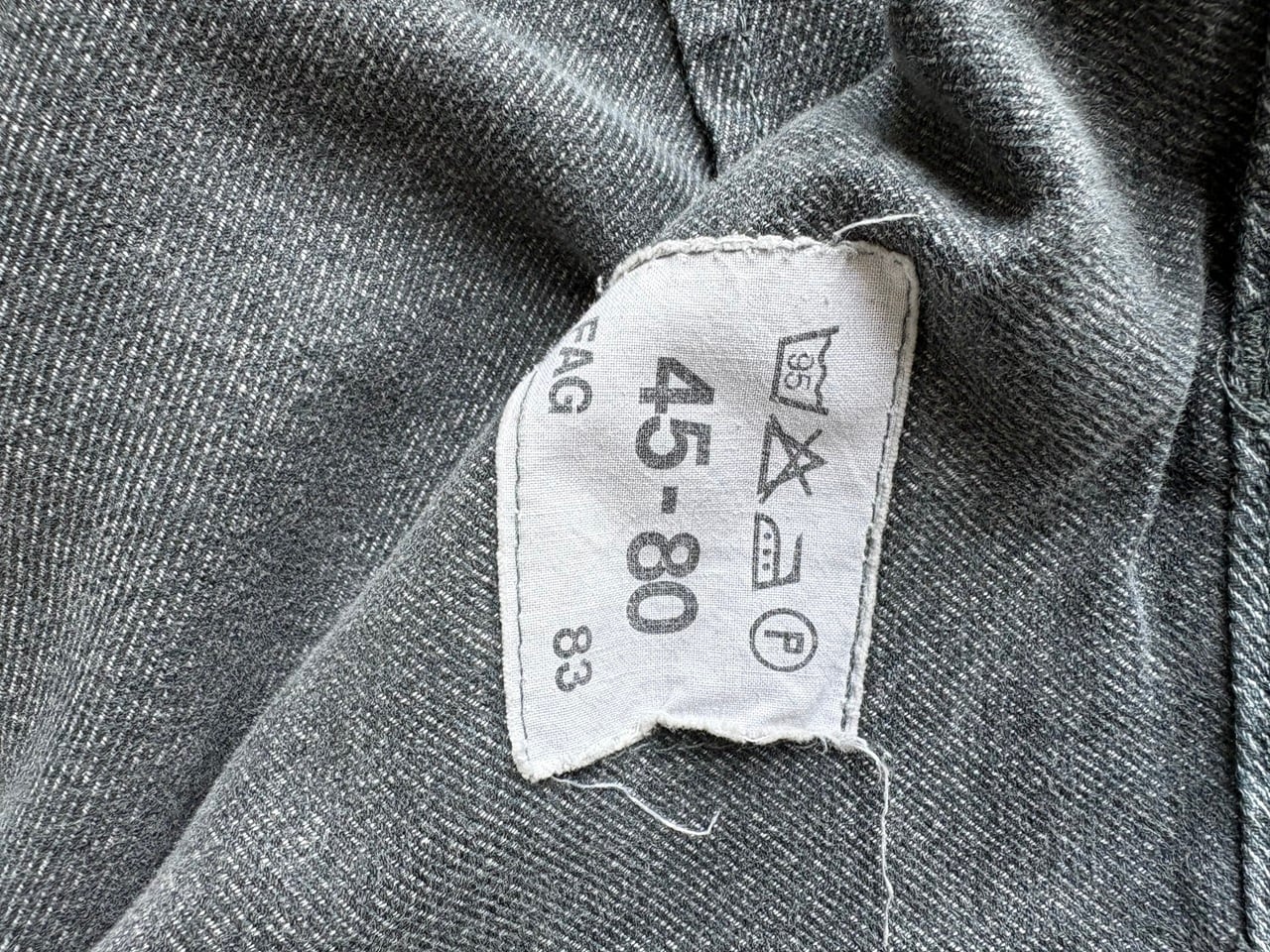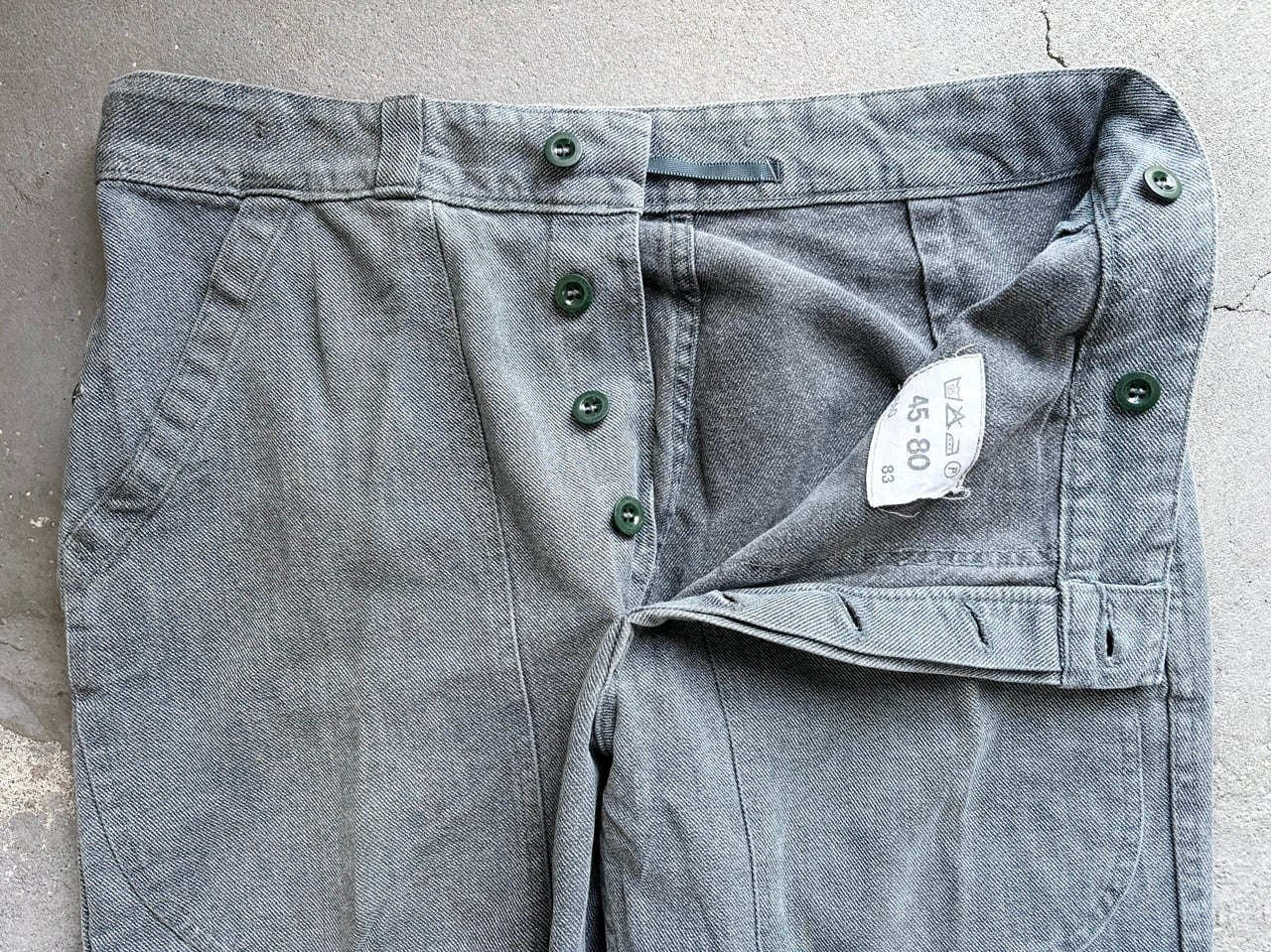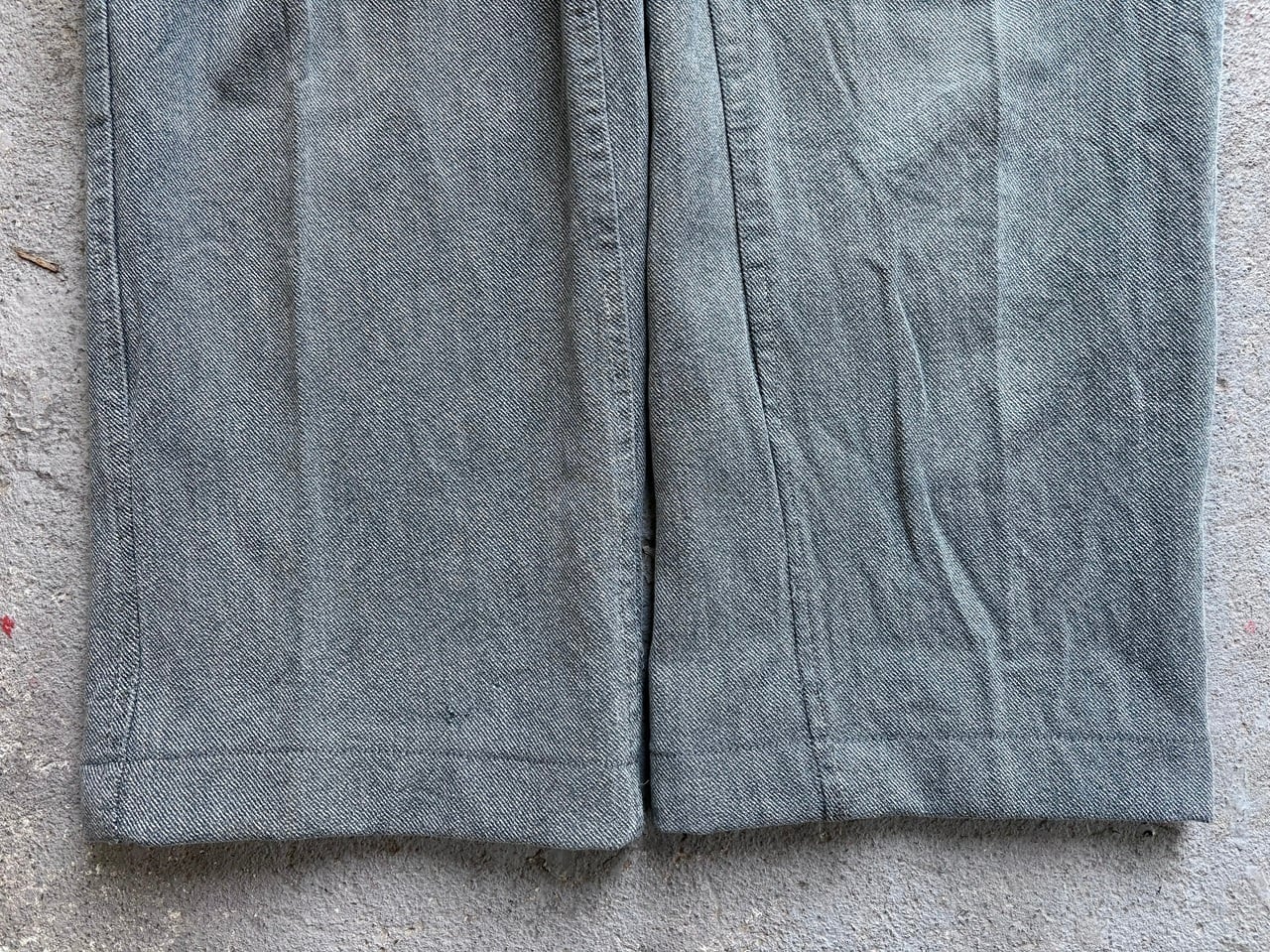ブランドタグがなく年代等の詳細は不明ですが、やや起毛感のあるコットンツイル生地を使用し、サスペンダーボタンや貫通ポケットを備えたクラシックなディテールが特徴的な一着。フロントはボタンフライでツールポケットが施されたワークパンツのような雰囲気を持ちながら、どことなくミリタリーテイストを感じる独特の雰囲気を放っています。武骨な印象が強すぎず、落ち着きのある大人カジュアルなコーディネートとも相性が良いアイテムです。
