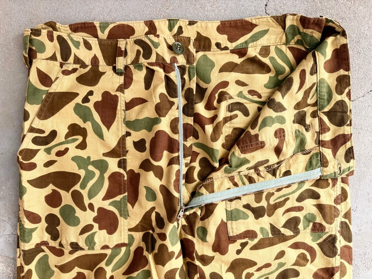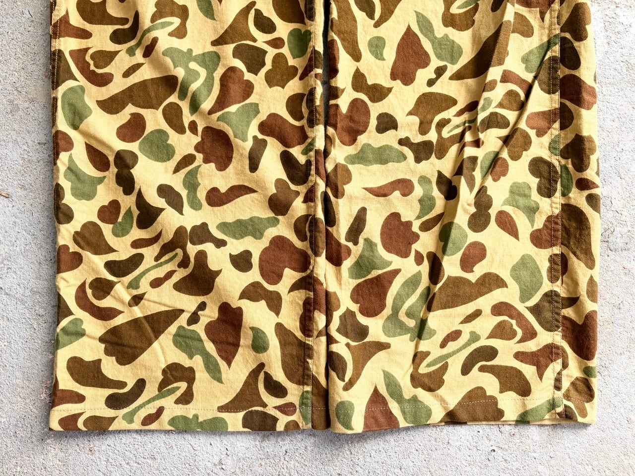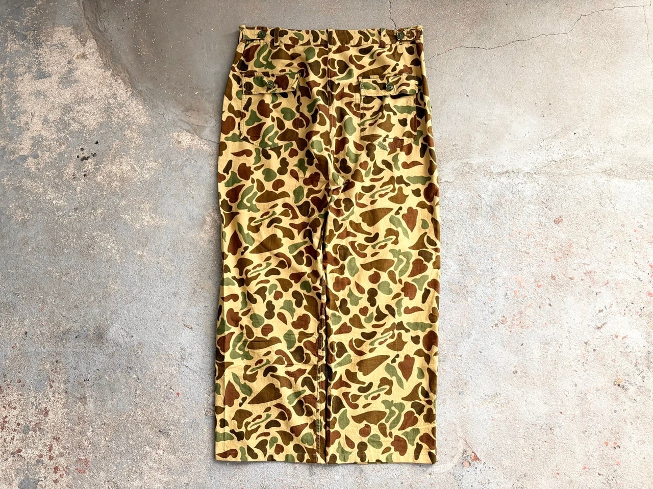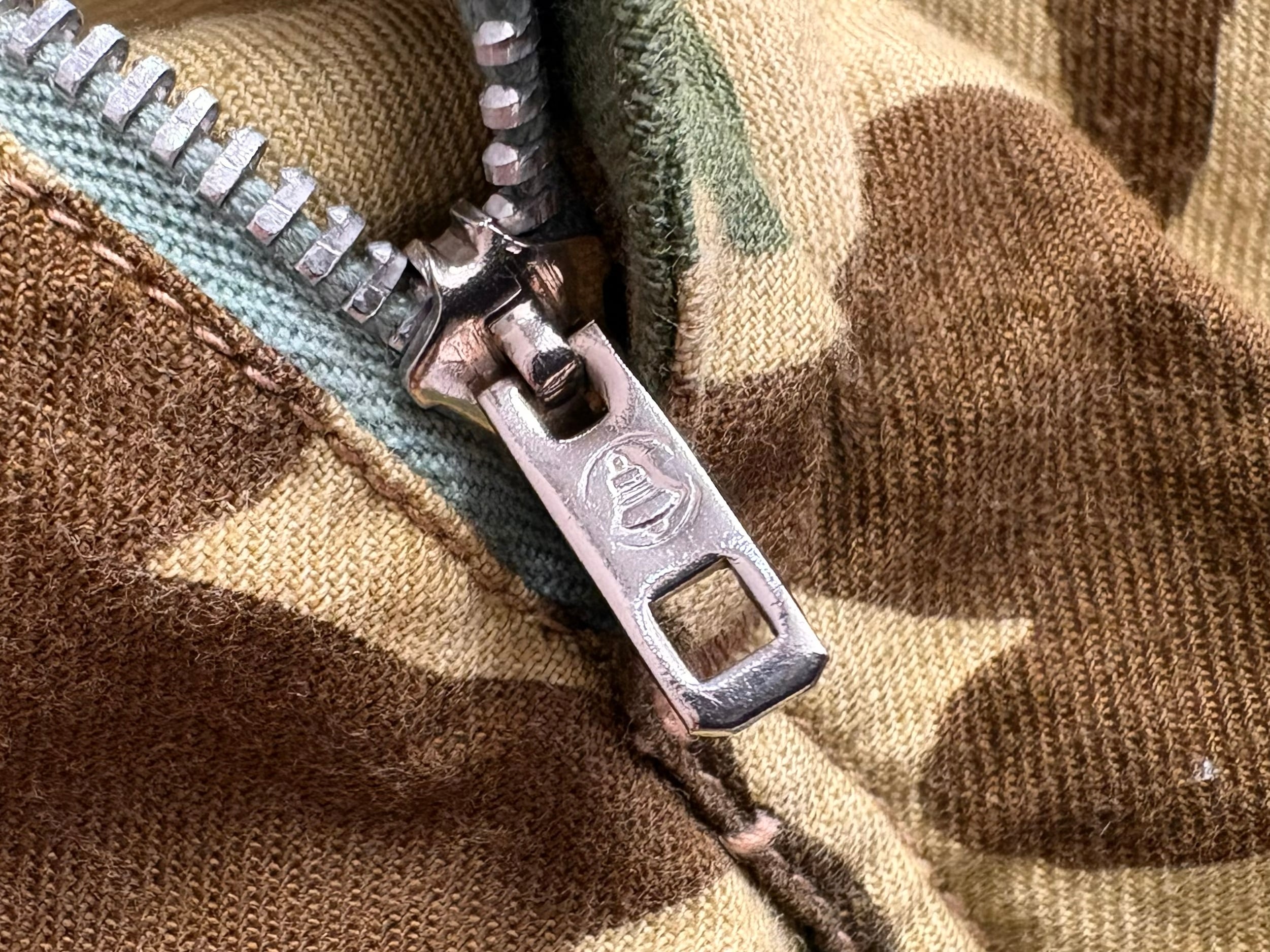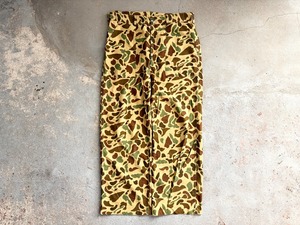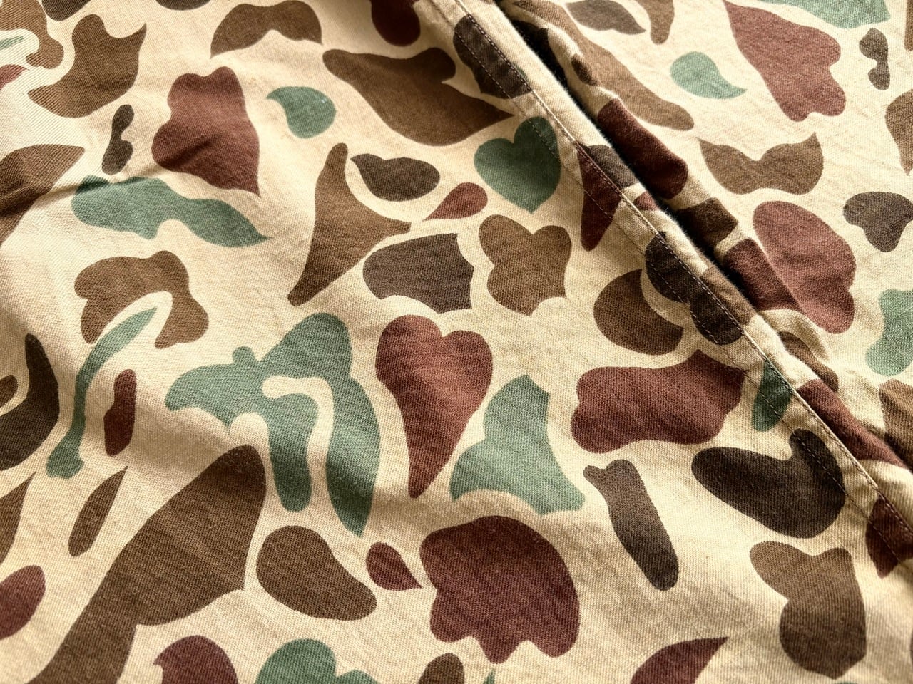 品質タグがないため詳細は不明ですがコットン系の軽やかな生地を使用し、ハート模様が組み込まれた迷彩柄が特徴的なベイカーパンツ。カーゴパンツに比べてすっきりとしたシルエットが印象的で、フロントにはクラシカルなベル刻印のアルミジッパーが使用されています。ミリタリー色が強くなり過ぎないポップなデザインなので、コーディネート次第で色々な雰囲気を楽しめるアイテムです。