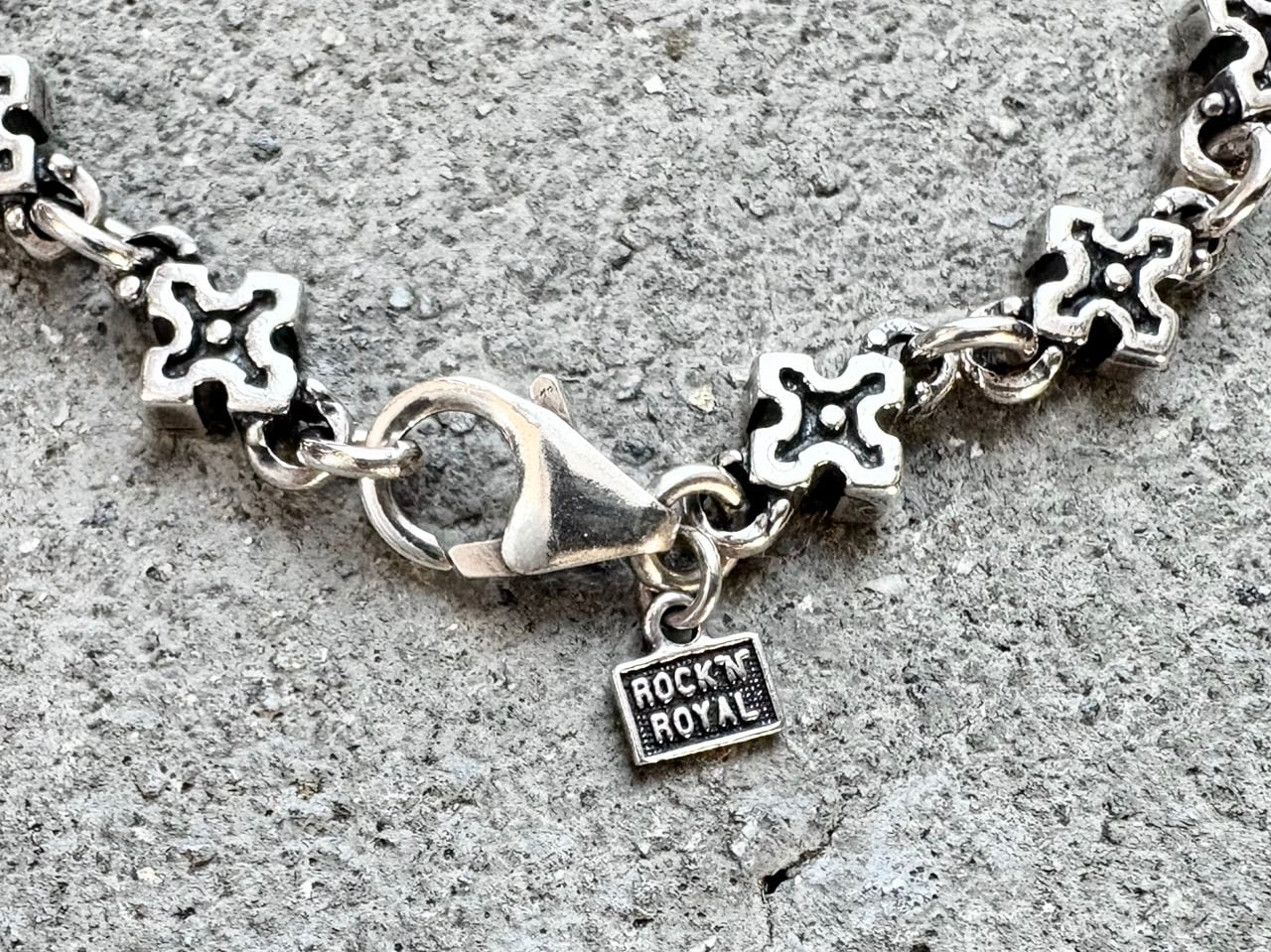 小ぶりのクロスモチーフを連結し、"ROCK'N ROYAL"のプレートを添えたロックテイストを感じさせるブレスレット。ロイヤルオーダーはデザイナーのシェリル・リクソン・デイビスにより1996年ロサンゼルスにて設立。女優としても活動していた頃に親交のあったハリウッドスターやセレブを中心にその名が広まり、質の高いシルバーやゴールドを用いた職人の手作りにより製作されるアイテムは、ゴージャスな雰囲気の中にも暖かみのある風合いが特徴です。また個性を尊重するハリウッドならではのエッセンスがデザインに落とし込まれている所も魅力の一つで、使い込む程に愛着が沸くような作り手の想いが込められたブレスレットです。