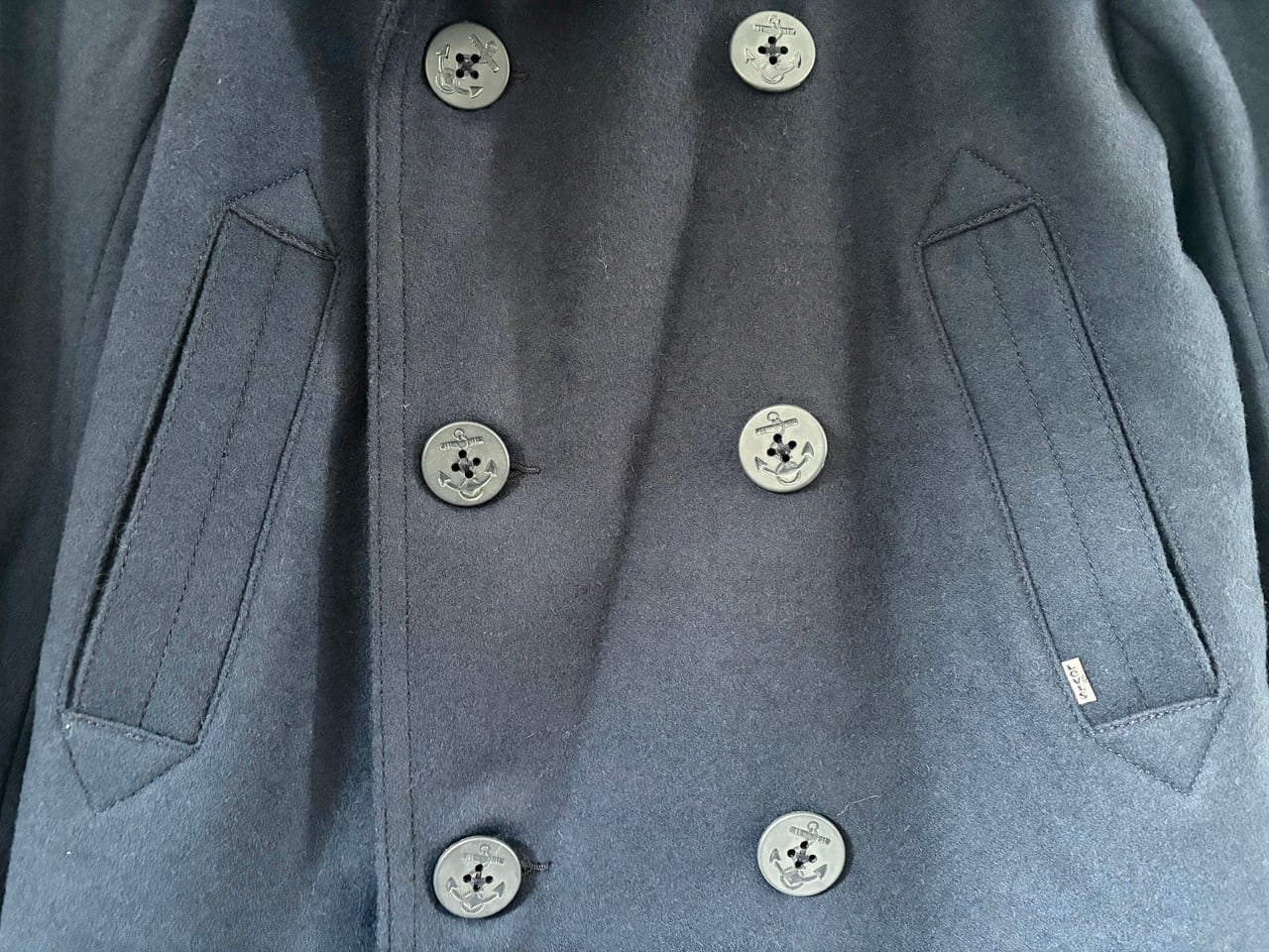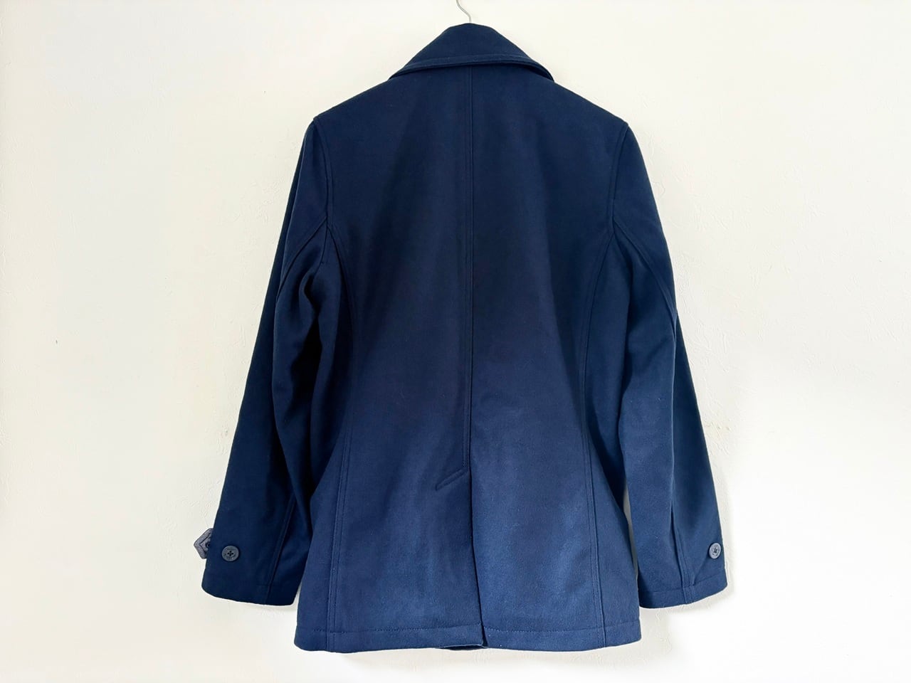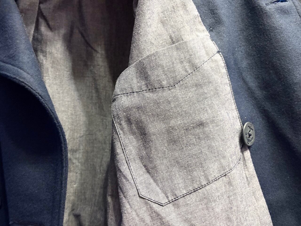 密度が高い暖かみのあるウールとコットン裏地で構成され、左右でボタンのかけ方を切り替えられるリーファーカラーが特徴的なミドル丈のピーコート。防風・防寒に配慮した大きめの襟や斜めに配されたマフポケット、海をイメージするイカリボタンなど、イギリス海軍の艦上用コートに由来するピーコートらしいディテールを備えています。パーカーやデニムなどのカジュアルなコーディネートにも合わせやすく、アウターとして羽織ることで落ち着きのある大人の印象を与えるアイテムです。