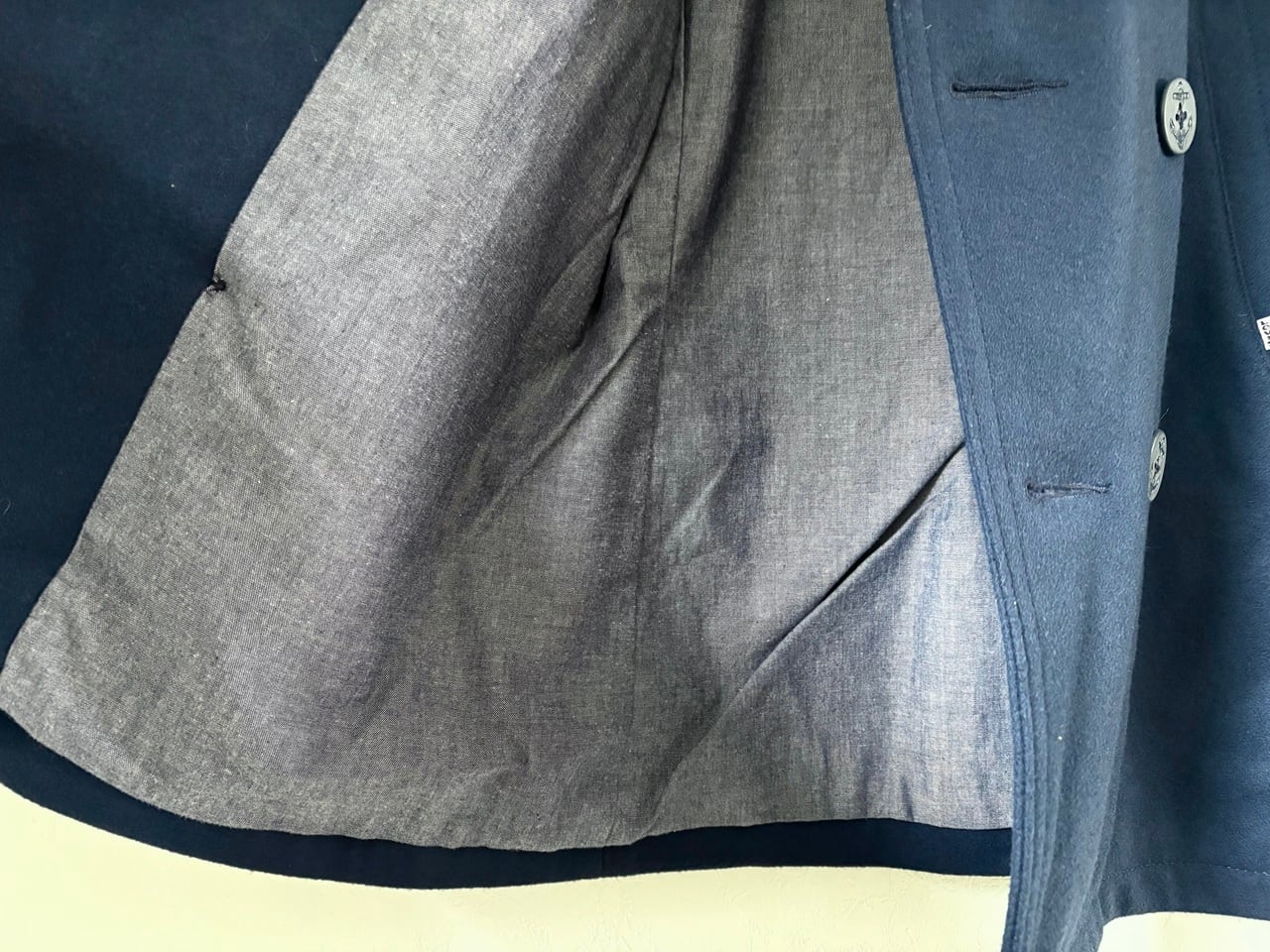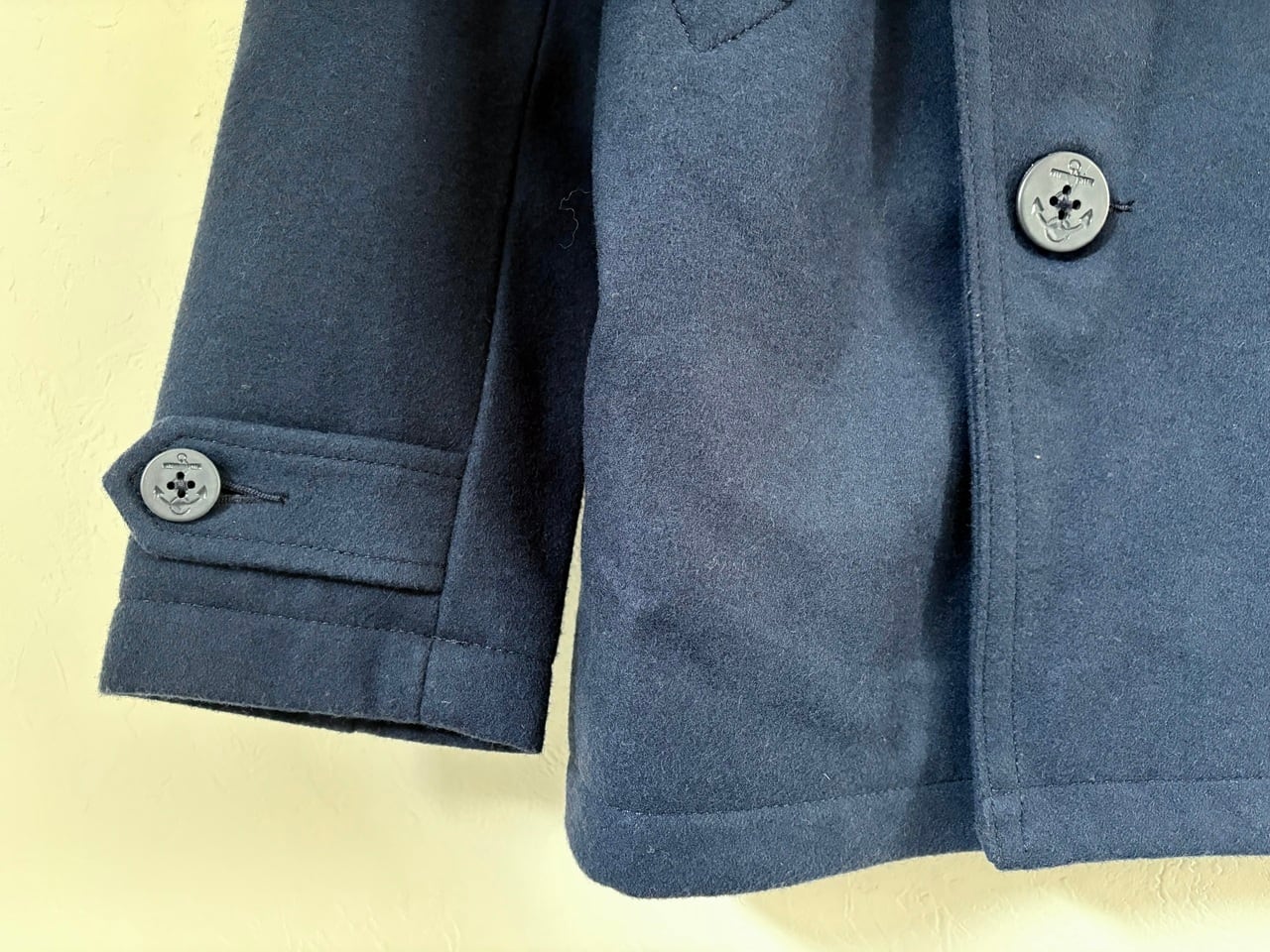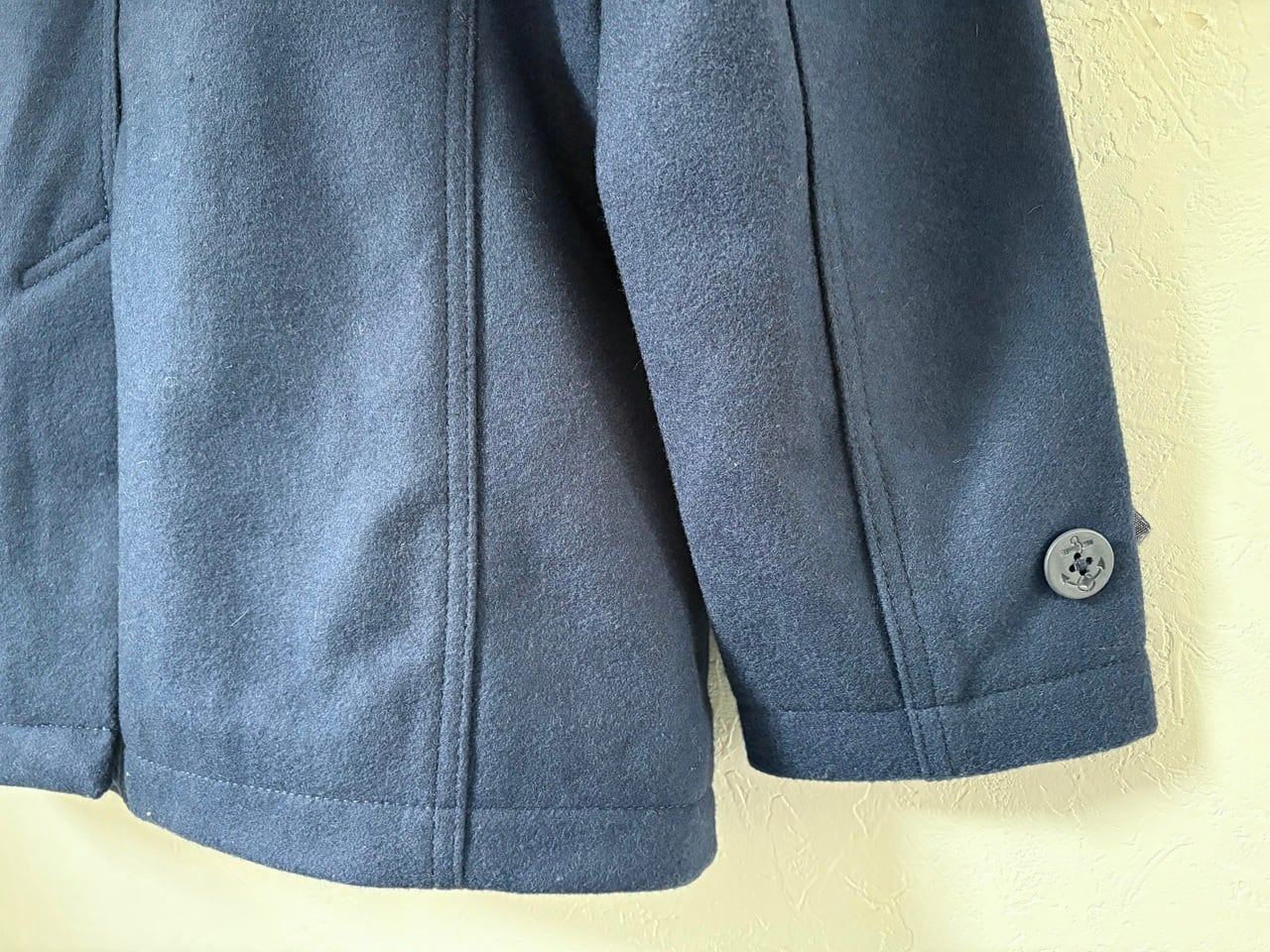 密度が高い暖かみのあるウールとコットン裏地で構成され、左右でボタンのかけ方を切り替えられるリーファーカラーが特徴的なミドル丈のピーコート。防風・防寒に配慮した大きめの襟や斜めに配されたマフポケット、海をイメージするイカリボタンなど、イギリス海軍の艦上用コートに由来するピーコートらしいディテールを備えています。パーカーやデニムなどのカジュアルなコーディネートにも合わせやすく、アウターとして羽織ることで落ち着きのある大人の印象を与えるアイテムです。