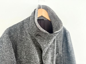 シルク、ウール、コットンなどの混紡生地を使用し、リブ付きの二重襟とサイドパネルが独創的なロングコート。その厳選された素材選びに加え、モード感溢れるディテールやエレガントなフォルム、チンストラップを備えた直立するスタンドカラーなど、独自性のあるテイストが随所に落とし込まれています。快適さと動きやすさを重視したデザインでありながら、伝統的な仕立ての概念に捉われないイッセイミヤケ・メンの前衛的なアプローチが光るアイテムです。