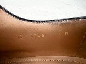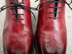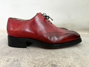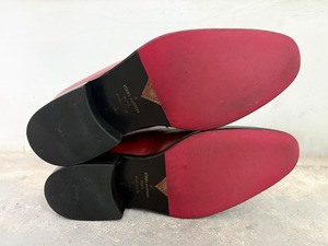濃い目のクラシックな赤を基調としたカラーリングに、ヒールからつま先にかけて徐々に深みを増すグラデーションが特徴的なレザーシューズ。つま先にはウイングステッチとメダリオンが施され、カジュアルさと威厳を兼ね備えた遊び心のあるディテールが印象的。革の質感は比較的柔らかく、全体に広がる上品な艶となめらかな風合いには、ルイヴィトンに相応しい落ち着きのある大人の気品と貫禄を感じます。長い歴史を持つラグジュアリーブランドならではの高級感が漂うレザーシューズです。