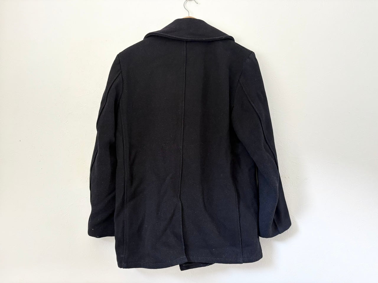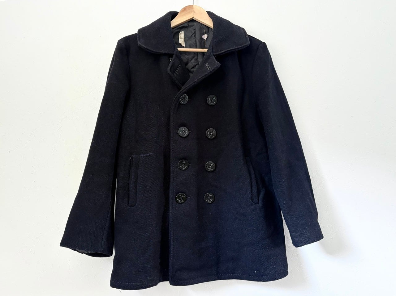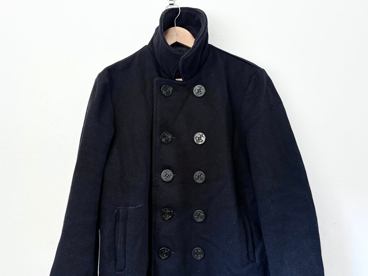 タグが一部欠損しているため年代や素材の詳細は不明ですが、耐久性のある厚手の生地を使用し、防風・防寒に配慮した大きめの襟や海をイメージするイカリボタン、リネン素材のような裏地のマフポケットなど、ヴィンテージ感のあるディテールを備えたピーコート。経年による破れなどのダメージが見られますが、重量感のある質感に加えてしっかりとした作りの重厚な雰囲気が印象的です。パーカーやデニムなどのカジュアルなコーディネートにも合わせやすく、アウターとして羽織ることで落ち着きのある大人の印象を与えるアイテムです。