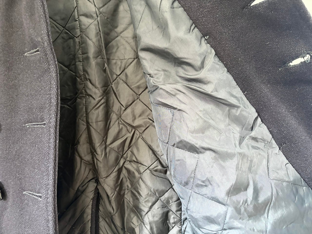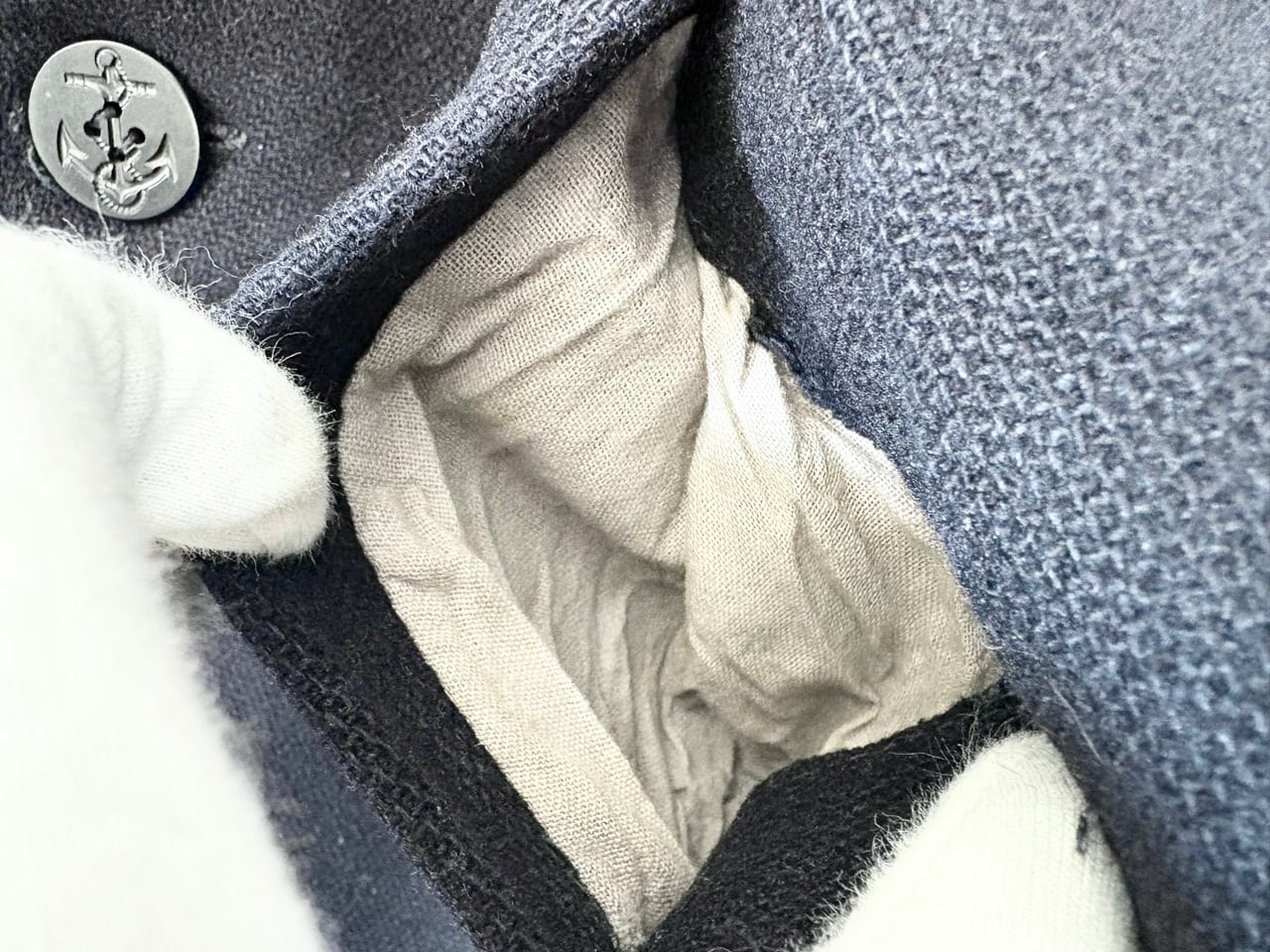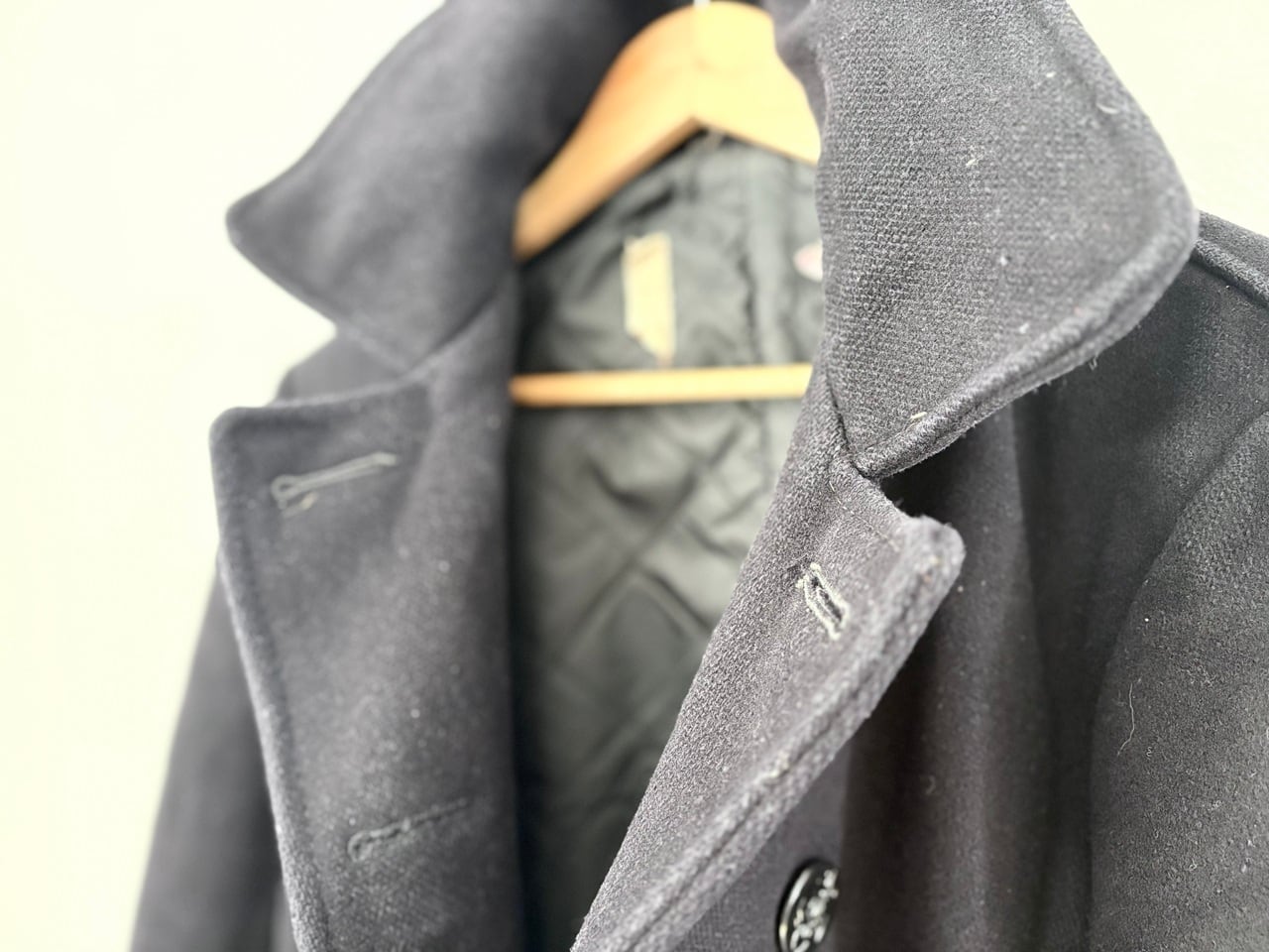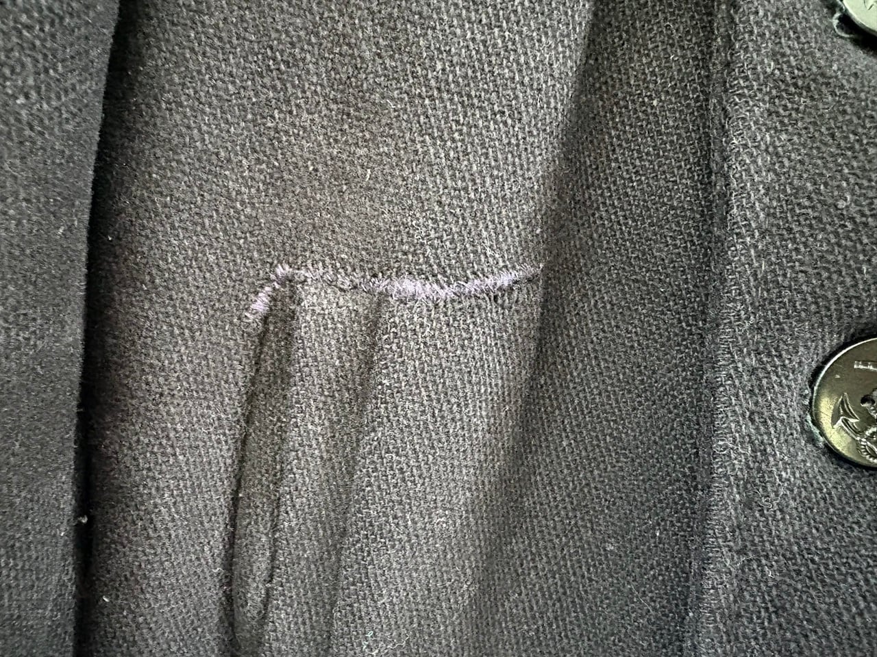 タグが一部欠損しているため年代や素材の詳細は不明ですが、耐久性のある厚手の生地を使用し、防風・防寒に配慮した大きめの襟や海をイメージするイカリボタン、リネン素材のような裏地のマフポケットなど、ヴィンテージ感のあるディテールを備えたピーコート。経年による破れなどのダメージが見られますが、重量感のある質感に加えてしっかりとした作りの重厚な雰囲気が印象的です。パーカーやデニムなどのカジュアルなコーディネートにも合わせやすく、アウターとして羽織ることで落ち着きのある大人の印象を与えるアイテムです。