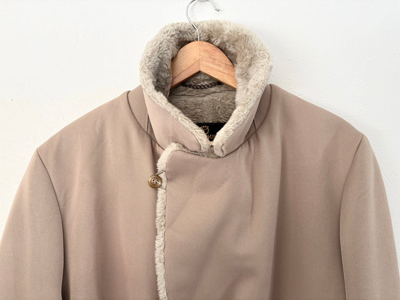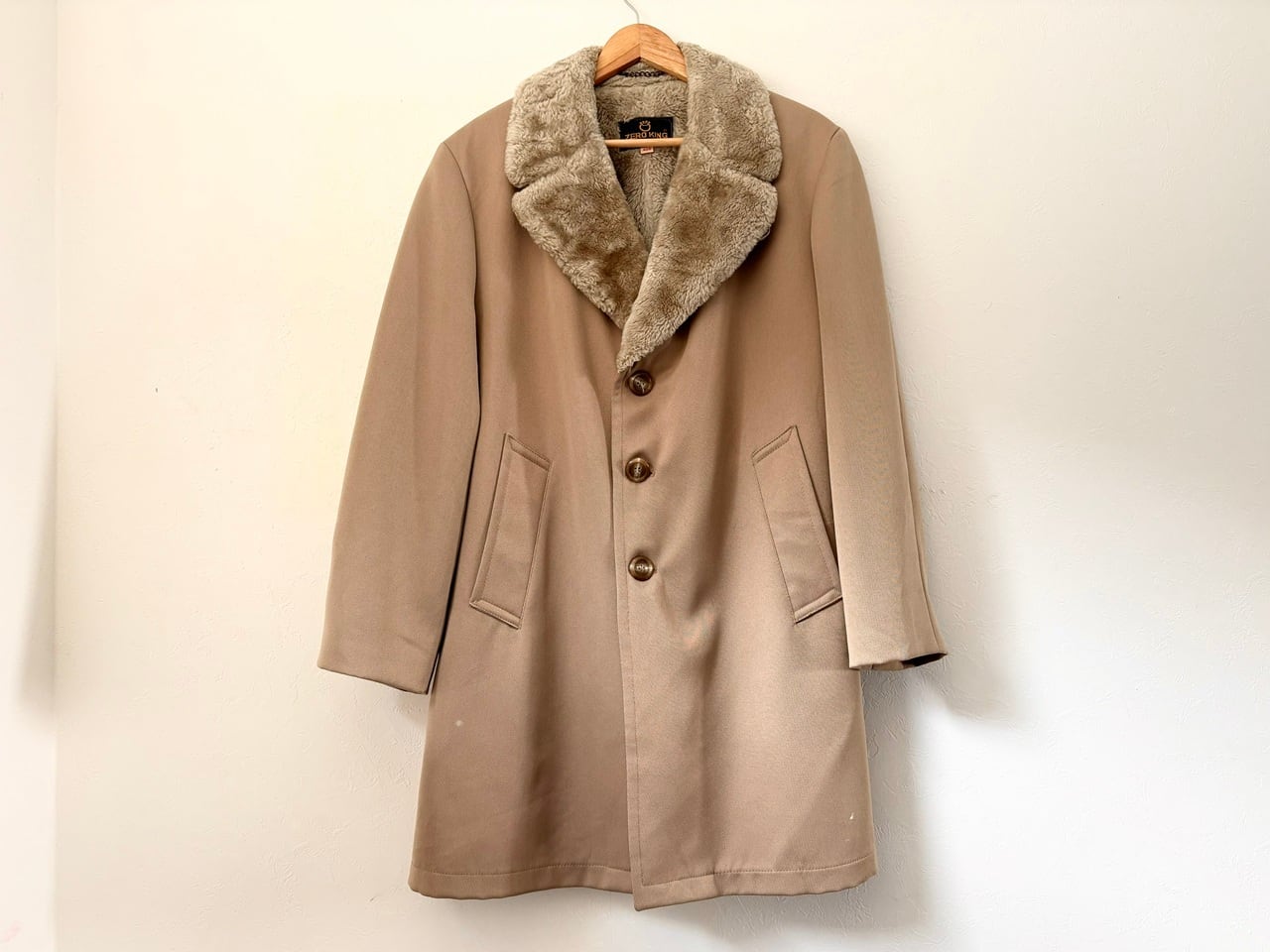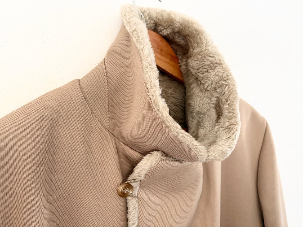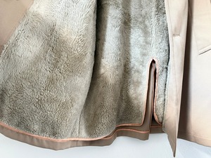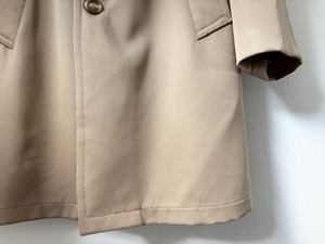 品質タグがないため素材の詳細は不明ですが、シェルと裏ボアの防寒性に配慮された二層構造で、最上段のボタンを留めるとスタンドカラーになる通称"ギャングコート"。ベージュを基調としたシンプルなカラーリング、そして武骨さと上品さを兼ね備えたデザインが特徴的で、その作りはしっかりMADE IN USA。年代を考慮しても特段のダメージは少なく、スーツと合わせた着こなしやパンクスタイルなど、組み合わせ次第で幅広いコーディネートが楽しめるコートです。