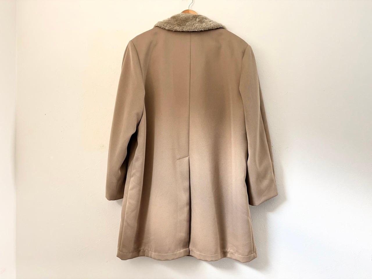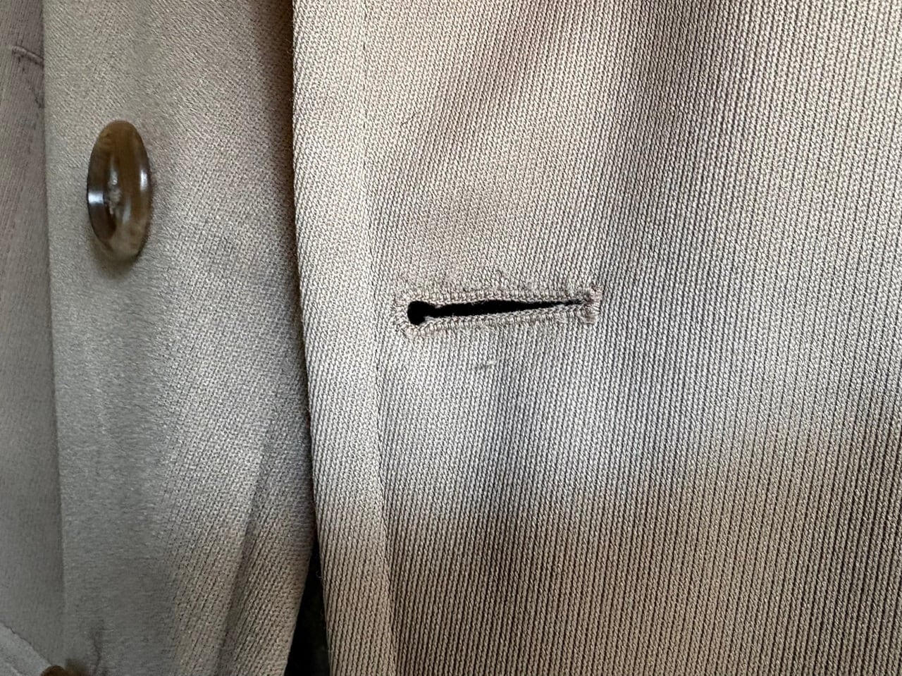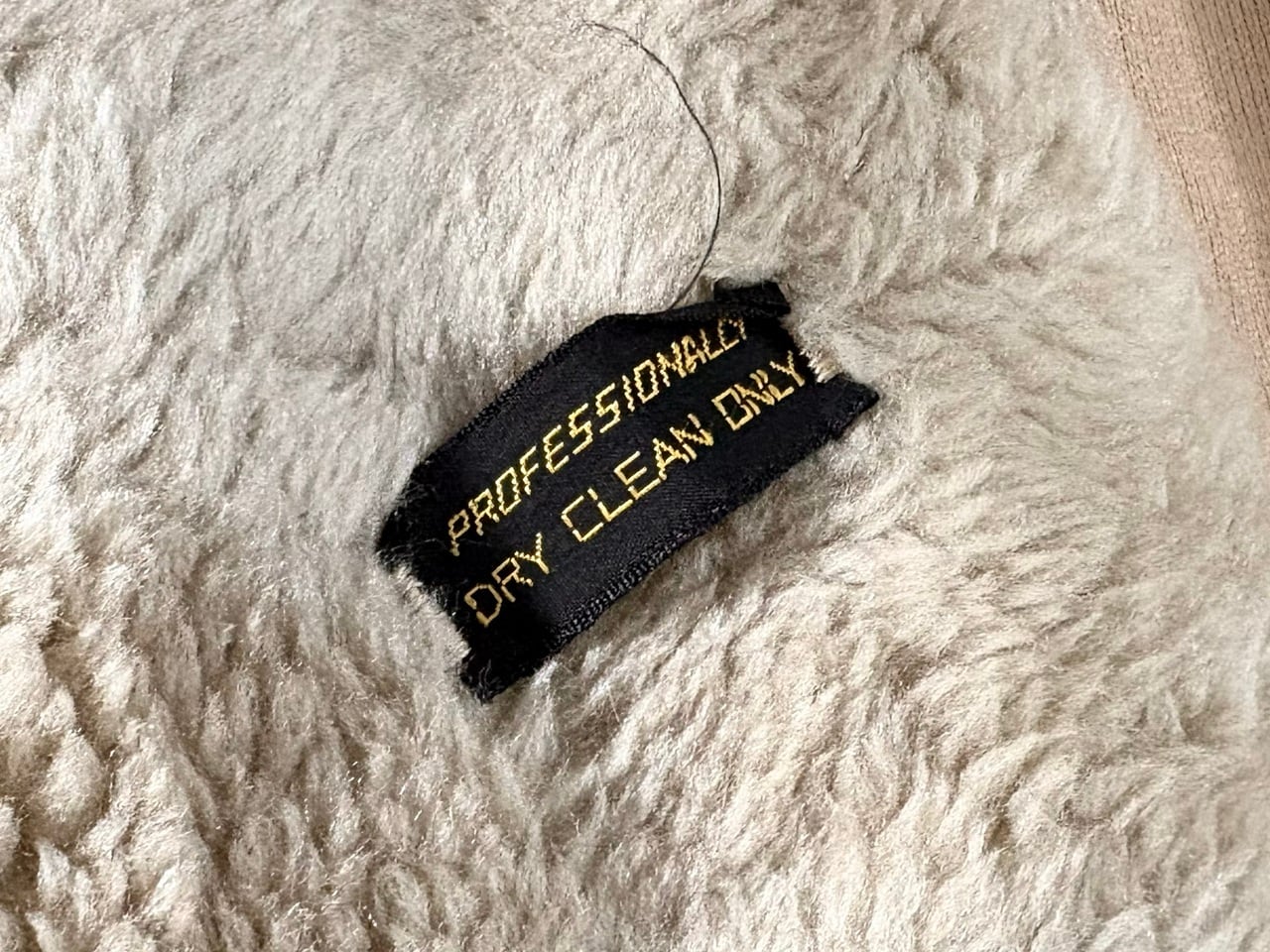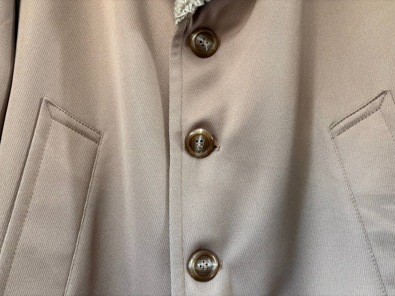 品質タグがないため素材の詳細は不明ですが、シェルと裏ボアの防寒性に配慮された二層構造で、最上段のボタンを留めるとスタンドカラーになる通称"ギャングコート"。ベージュを基調としたシンプルなカラーリング、そして武骨さと上品さを兼ね備えたデザインが特徴的で、その作りはしっかりMADE IN USA。年代を考慮しても特段のダメージは少なく、スーツと合わせた着こなしやパンクスタイルなど、組み合わせ次第で幅広いコーディネートが楽しめるコートです。
