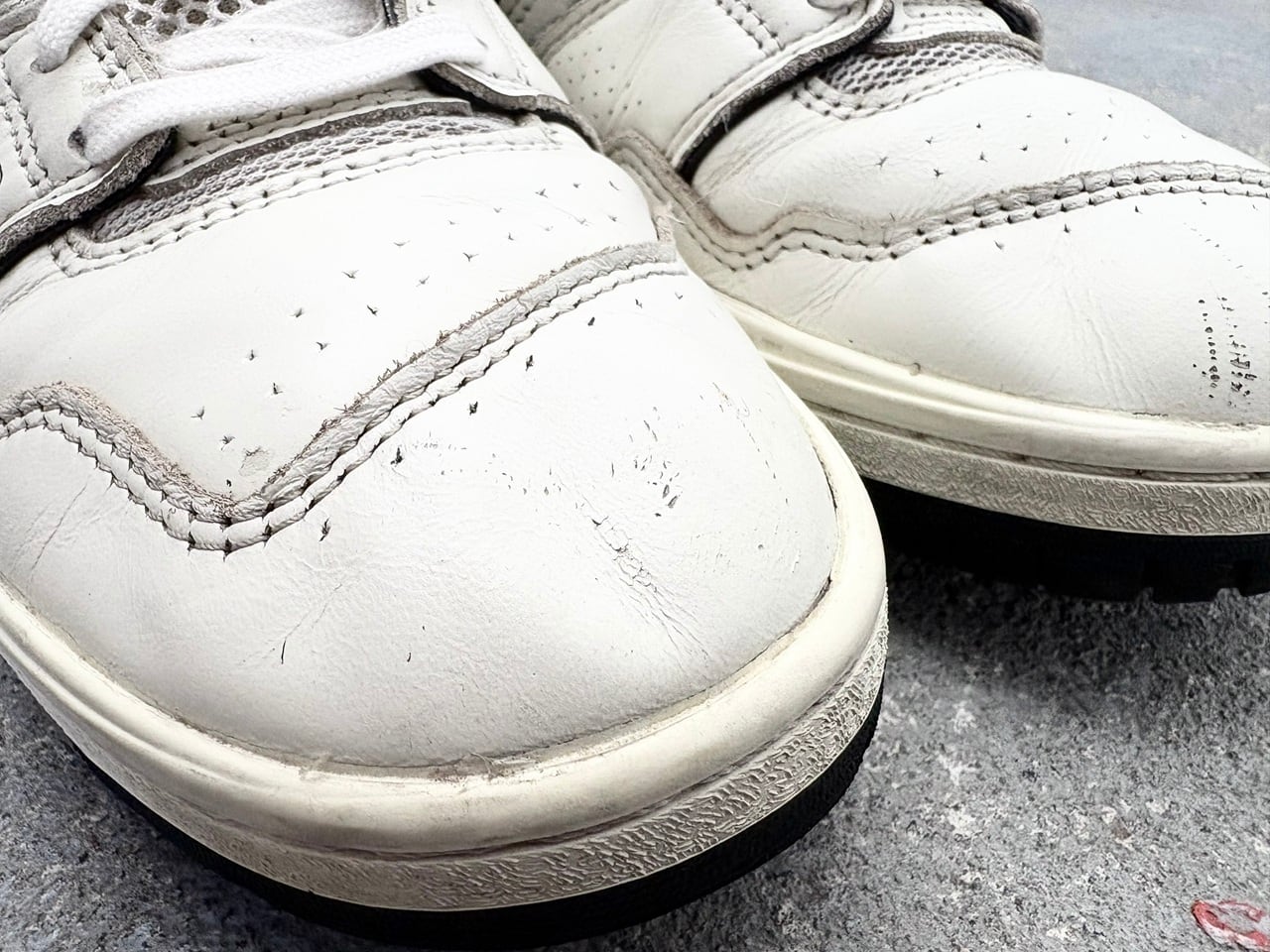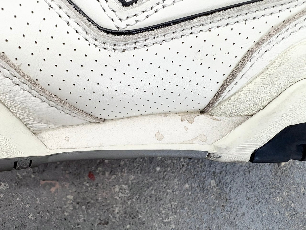 かつてのローテク感があるフォルムはそのままに、アッパーには高級感のあるパンチングレザーを採用。味のある風合いを纏ったホワイトにブラックのアクセントカラーを落とし込み、モダンで精悍なデザインが印象的。現代的なアップデートを施しつつ、どことなくビンテージライクな雰囲気を持つレトロな一足です。