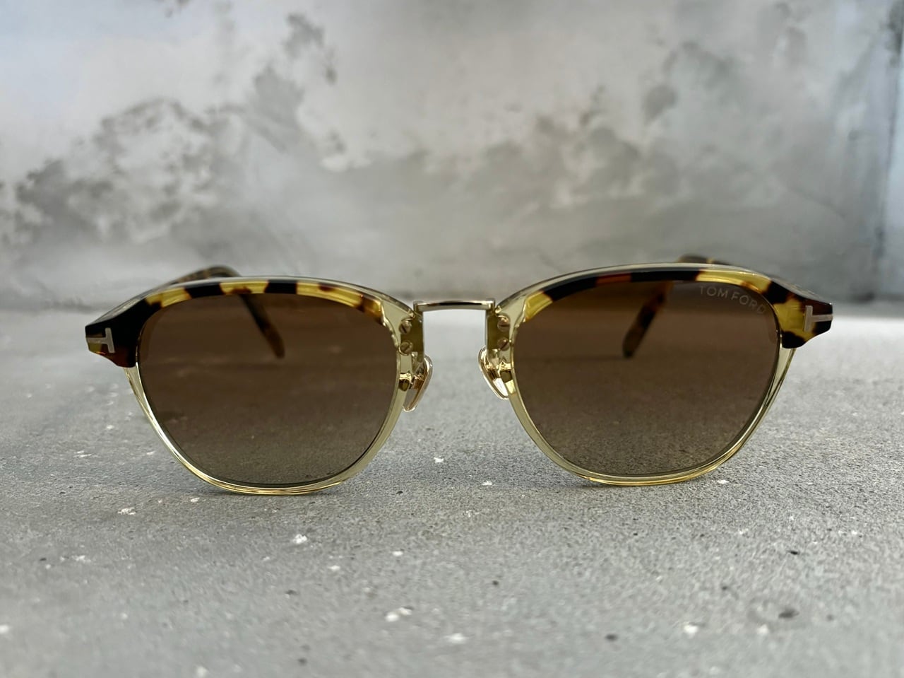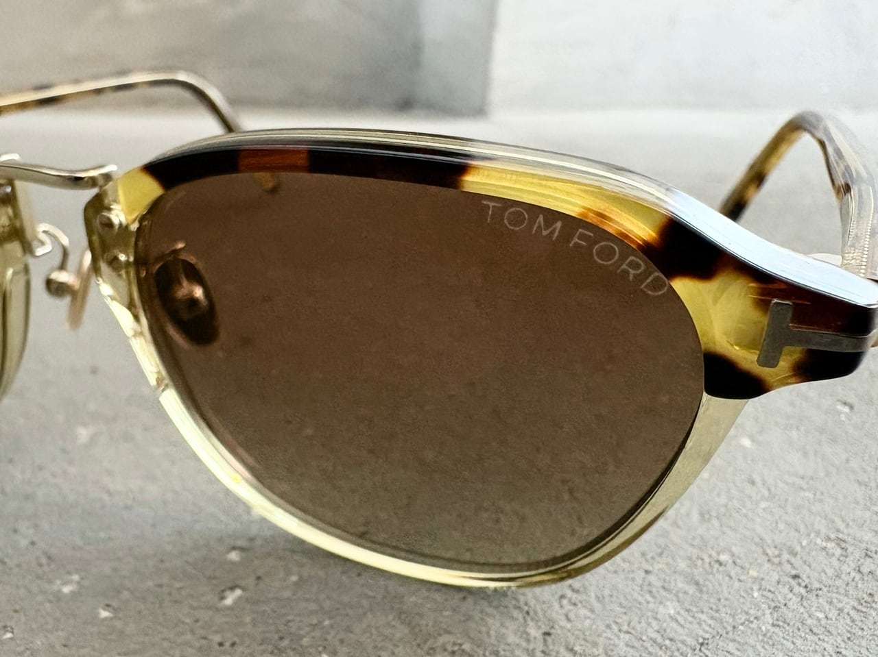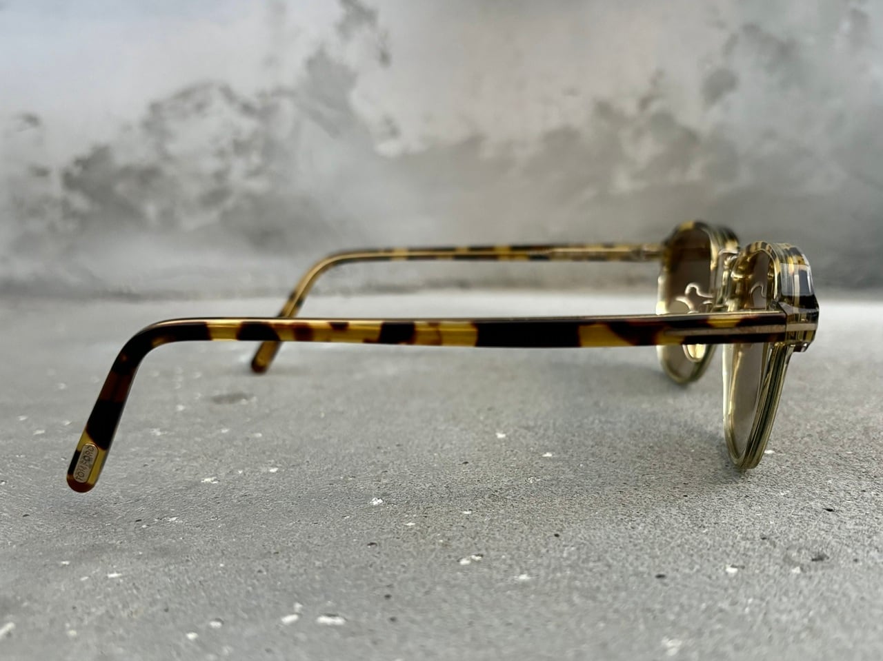 ウェリントンベースのクリアフレームに、べっ甲柄を施したクラシックかつモダンな雰囲気を纏ったサングラス。象徴的なTマークをはじめクリングスタイプのメタルノーズパッドや、目元を美しく見せるシルエットが特徴的なフロント上リム部分のカッティングなど、全体的なバランスの取れたデザインと高級感のあるディテールが印象的です。トム・フォードは1990~2000年代、グッチやイヴ・サンローランのクリエイティブディレクターを経て、ファッション業界に留まらずアートや映像分野などでも第一線で活躍し続けるデザイナー。中でもサングラスは高級感がありながら落ち着いたカラーリングと無駄のないデザインで、世界中の映画俳優や著名なファッショニスタを魅了し続けています。