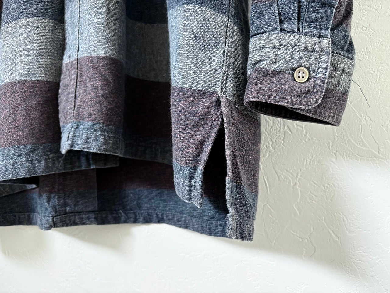 配色が異なるプリズナーテイストのボーダー柄が施され、襟無しのバンドカラーが特徴的なコットンシャツ。前後で異なる丈や背面のセンタープリーツ、可動域に配慮された裾スリットなど、シャツに特化したThe Shirtラインならではのこだわりと日常生活での使いやすさが融合したディテールが印象的です。ファッションブランドとしての枠を超え、"東洋の美学"とも評されるイッセイミヤケの革新的な創造性と卓越した技術が詰まったアイテムです。