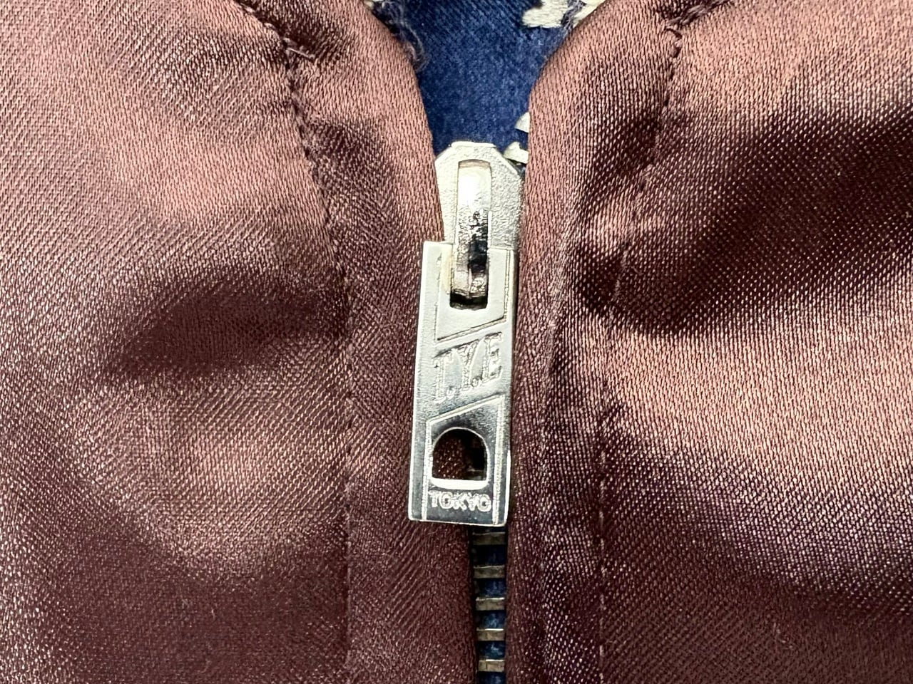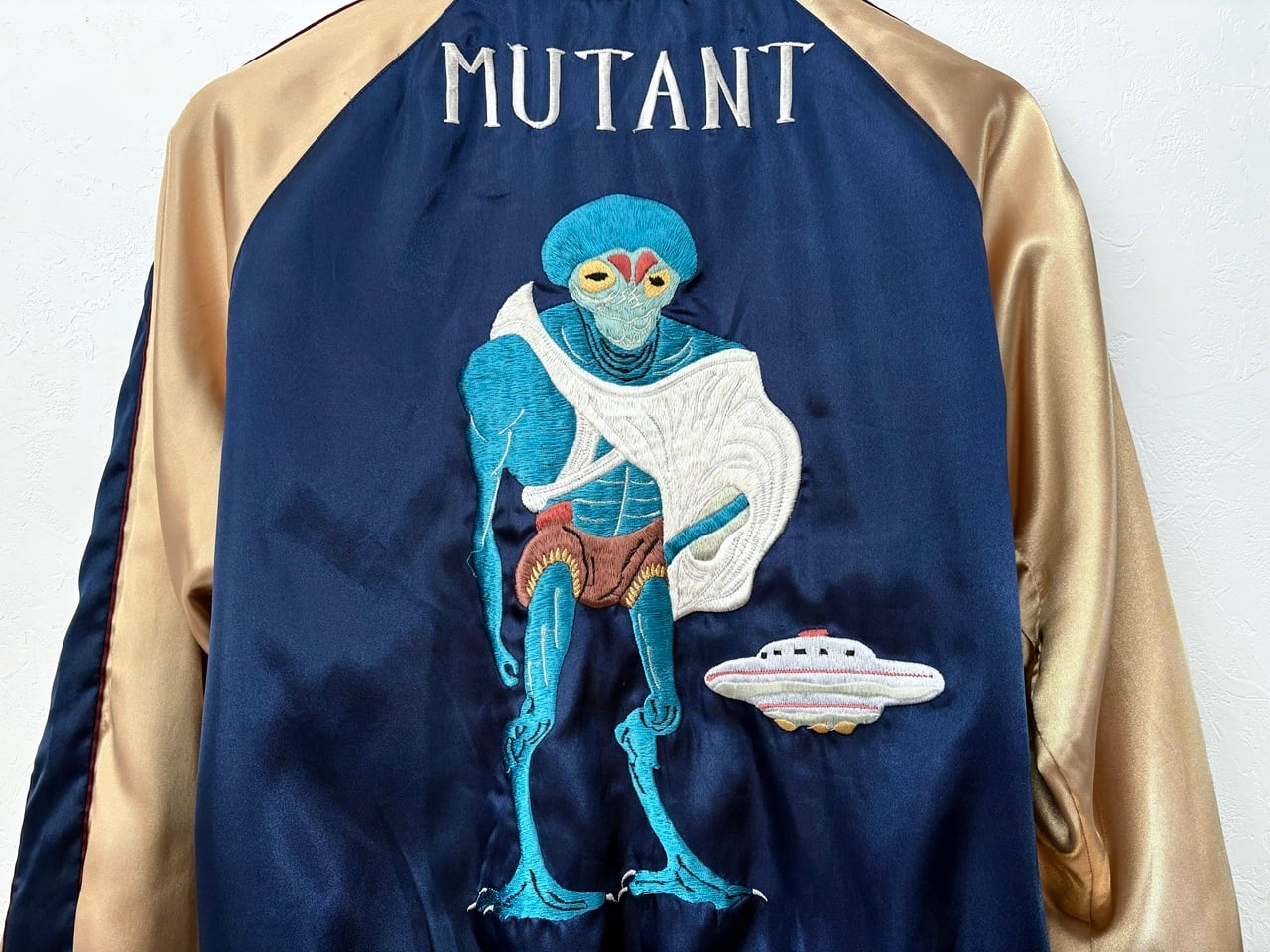 ジャパントラディショナルの豪華な刺繍ワークがインパクトのある横須賀ジャンパー、通称"スカジャン"。和テイストを感じさせるデザインでありながら、米軍兵士のお土産品を起源とする海外へ向けた和洋折衷の独特な雰囲気が魅力。表面はブラウンのベースカラーに鷲、富士山、日本地図、龍のダイナミックな刺繍が鎮座し、裏面にはどことなく愛嬌のあるUFOと宇宙人をモチーフにしたMUTANTのデザインが施されています。スカジャンは一過性の流行ではなくカルチャーとして現代にも継承され、半世紀以上に渡りスーベニアジャケットを作り続けるテーラー東洋の象徴的なアイテムです。