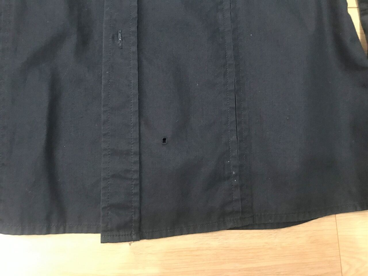 袖が長いブラックドレスシャツでボタンを留めずに着るのも良し。身体のラインが出やすいようにデザインされているのでサイズ感は比較的タイトです。