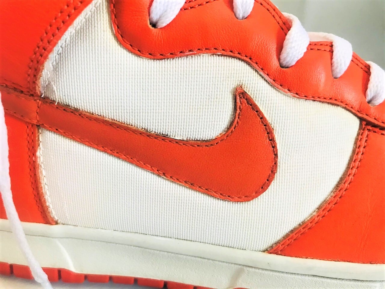 明るめの鮮やかなオレンジとホワイトのコントラストは80年代のオールドスクールを体現。惜しくも右足のメッシュ部分とアンクルにリペイントが見られますが、減りがちなヒールも残っていて全体的な状態はまずまずかと◎