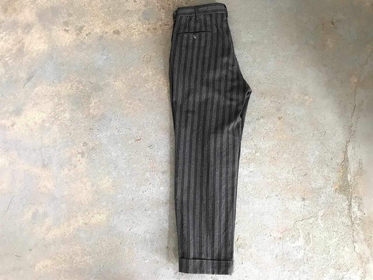 ランチパンツのようにジッパーを腰元に配置することで、すっきりしたウエストラインを生み斬新なデザインに仕上がっています。素材には90年代デッドストックのストライプ柄デニム、12ozライトウェイトを採用。ツータックを活かした緩やかなテーパードシルエットの上品なスラックスです。