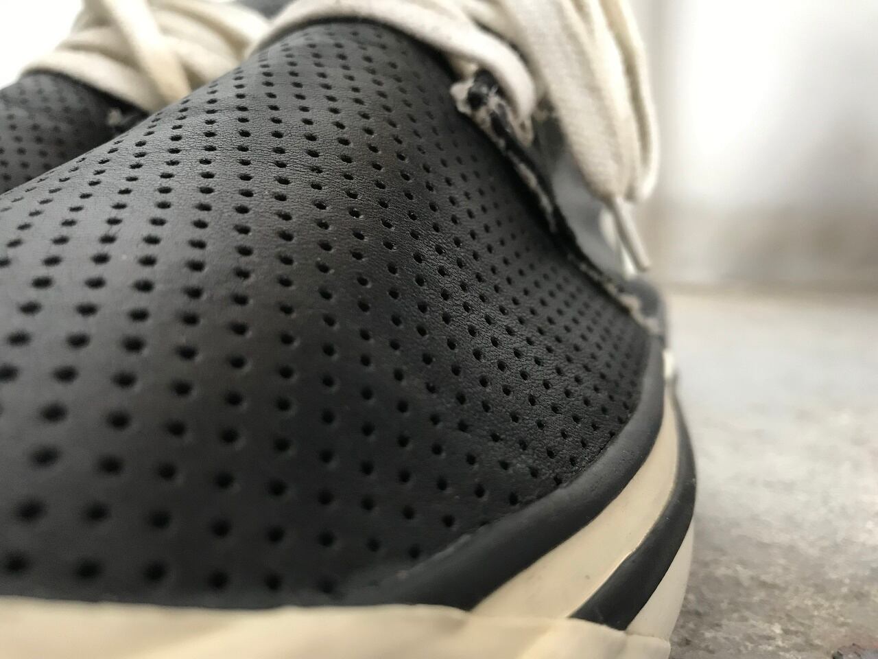 タグが見当たらず詳細は不明ですが、柔らかくしなやかなパンチングレザーの優しい履き心地と、つま先を覆うようなラバーの絶妙なデザインが特徴。比較的足幅が広めな方にもおススメです◎