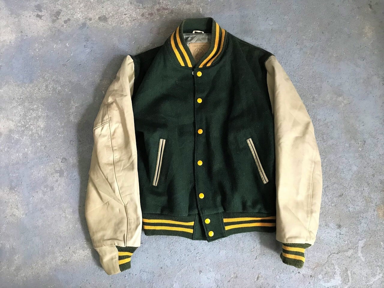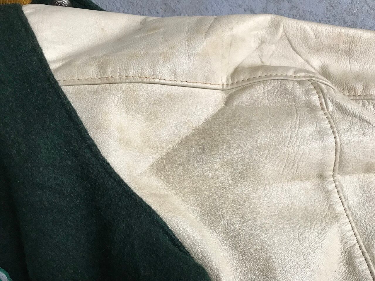 バスケチームのセルティックカラーを彷彿させる、四葉のクローバーとグリーン×イエローのカラーコンビネーションが秀逸でかっこいいです。ボタンはSCOVILL製で、袖の先までレザーを一部施したカフスプロテクターもゴールデンベアならでは。袖部レザーに経年染みが見られますが、MADE IN CALIFORNIA U.S.A.の古き良きヴィンテージ感漂うスタジャンです◎