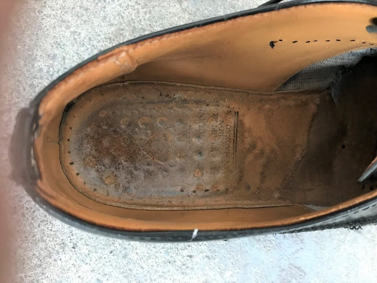 つま先のブローグや側面のパーフォレーションといった穴装飾は、トラディショナルでありながら華やかさも持ち合わせた雰囲気を醸し出しています。全体的に補修跡が見られますが、丸形のつま先など味のあるデザインとマッチしていてヴィンテージ感漂うアイテムです◎