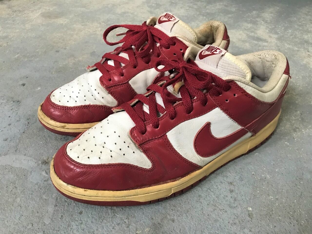 数あるダンクシリーズの中でも、様々なモデルでサンプリングされる事も多い屈指の人気を誇るカラーリング。20年弱前の当時物とあって味のあるヴィンテージ感が漂っており、ソールはややクッションが見られるものの一部亀裂が入っています。その他、タグの擦り切れなど状態は経年相応といった所ですが、レトロなフォルムや柔らかいレザーの質感など現行物とは異なる古き良き魅力が詰まったスニーカーです◎