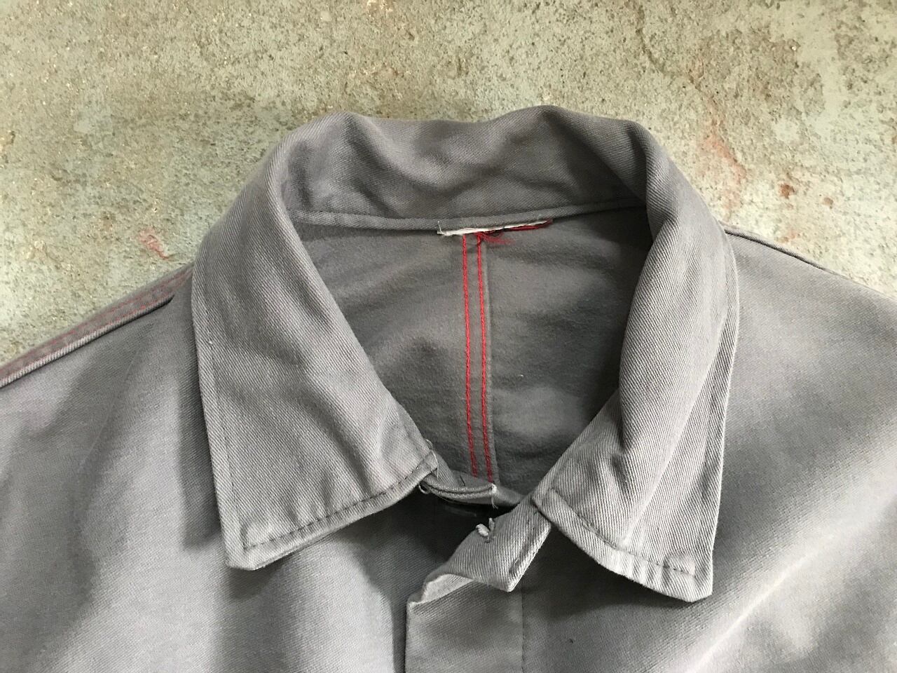 タグが切れておりブランドや素材の詳細は不明ですが、厚手のコットン系生地を使用し、くすみのあるグレーカラーがヨーロッパ調の雰囲気を醸し出しています。また、裏地はなめらかな肌触りの表地とは異なる素材感で、袖口の絞り調整ボタンやレッドステッチ、インナーポケットなど細かなディテールにもこだわりが見られます。クラシカルテイストで程良く使い込まれた味のあるジャケットです◎