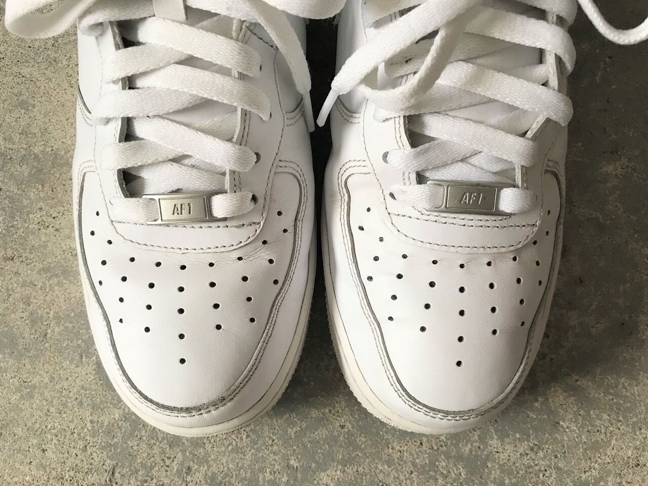 ホワイト一色のシンプルなカラーはどんなコーディネートにも合わせやすく、ファッションに落とし込みやすいミッドカット特有のシルエットが特徴的。エアフォース1は1982年に発売されたバスケットボールシューズが原点となっており、その高い機能性や耐久性、スタイルが人気を集めています。また、軽量かつクッション性に優れたソールを搭載しているため歩きやすいのも魅力の一つです。履き口とアウトソールに汚れが見られますが、その他は特段のダメージが少ないコンディションです。