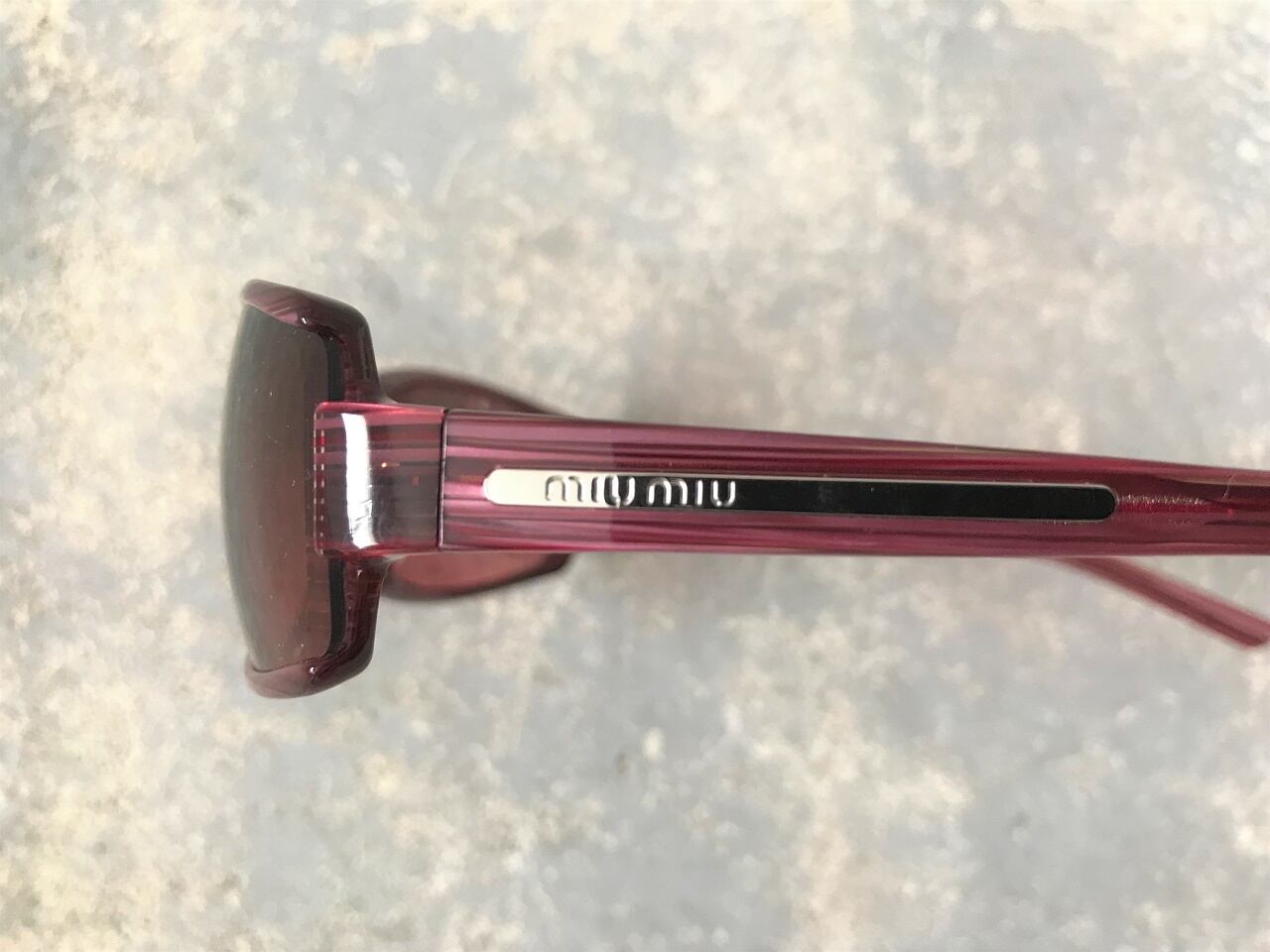 プラダの姉妹ブランドでもあるミュウミュウは、デザイナー・ Miuccia Pradaのニックネームに由来。レディースラインのアイテムが主ですが、2007年頃まではメンズラインも展開しておりプラダの人気と併せてメンズラインのアーカイブも再評価されています。ミュウミュウらしいワインレッドのガーリーな雰囲気でありながら、目元が引き締まった印象を与えるスクエアタイプのサングラスです。