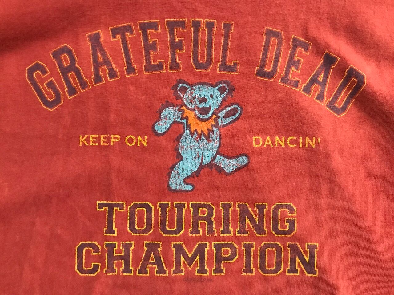 ヒッピーなどカウンターカルチャーの中心地として知られるサンフランシスコ・ベイエリアで結成し、1965~1995年頃まで活動。その音楽はカントリーやブルース、ロック、ジャズなどのミクスチャースタイルで形成され、ジャムバンド界のパイオニアとして広く認知されています。通称"デッドヘッズ"と呼ばれるファンに愛されているのがダンシングベア。サイケデリックで愛嬌のあるクマが踊るロゴはグレイトフルデッドのアイコン的存在とも言えます。前背面に部分色褪せが見られますが、古き良きバンドTシャツらしい味のあるTシャツです◎