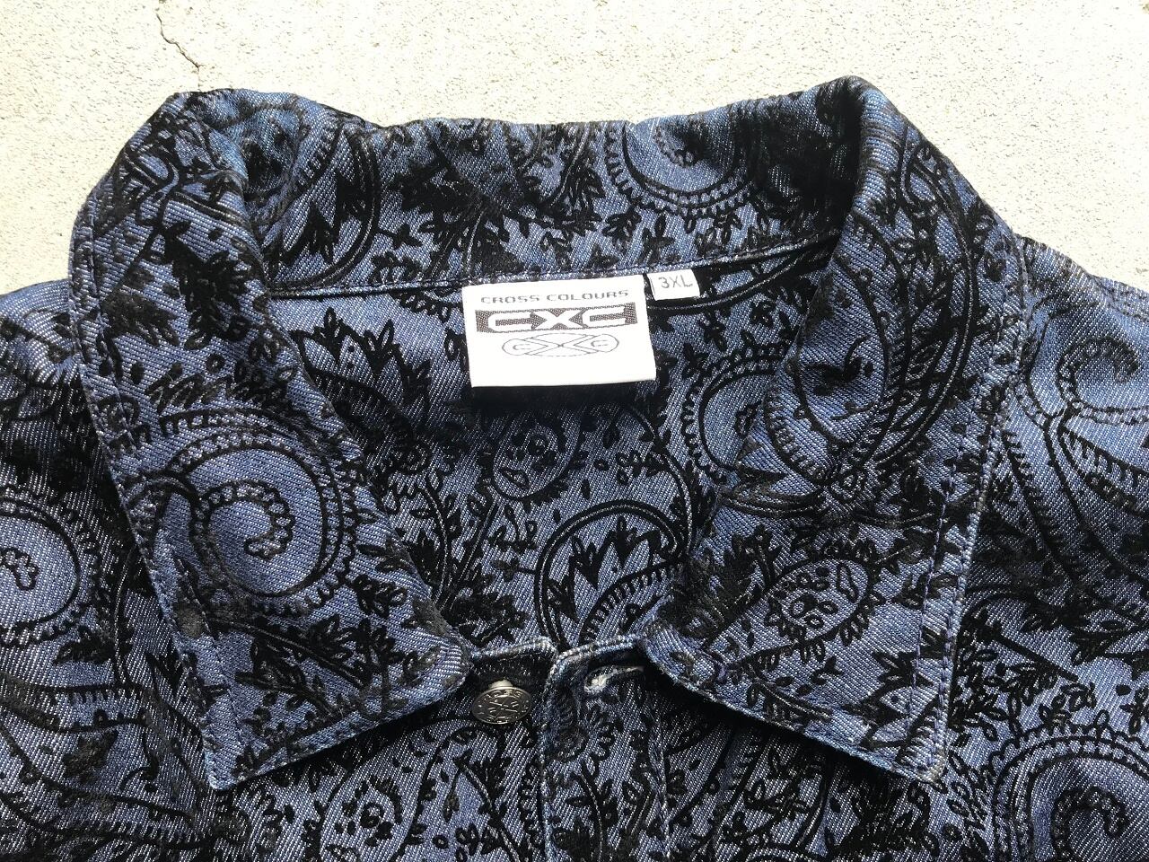 HIP HOPやダンスミュージックなど、ブラックカルチャーをルーツに持つクロスカラーズ。展開するアイテムには原色の派手目なカラーリングが多い中、デニム生地に細かなペイズリー柄の刺繍が施されたちょっと珍しいシックなデザイン。3XLのビッグシルエットなので大き目サイズのジャケットをお探しの方も是非◎