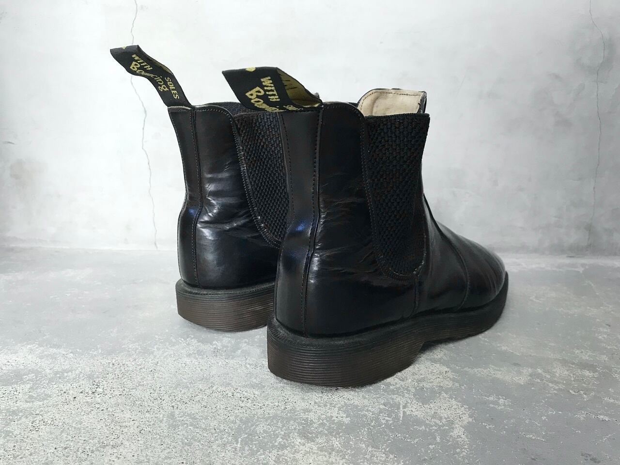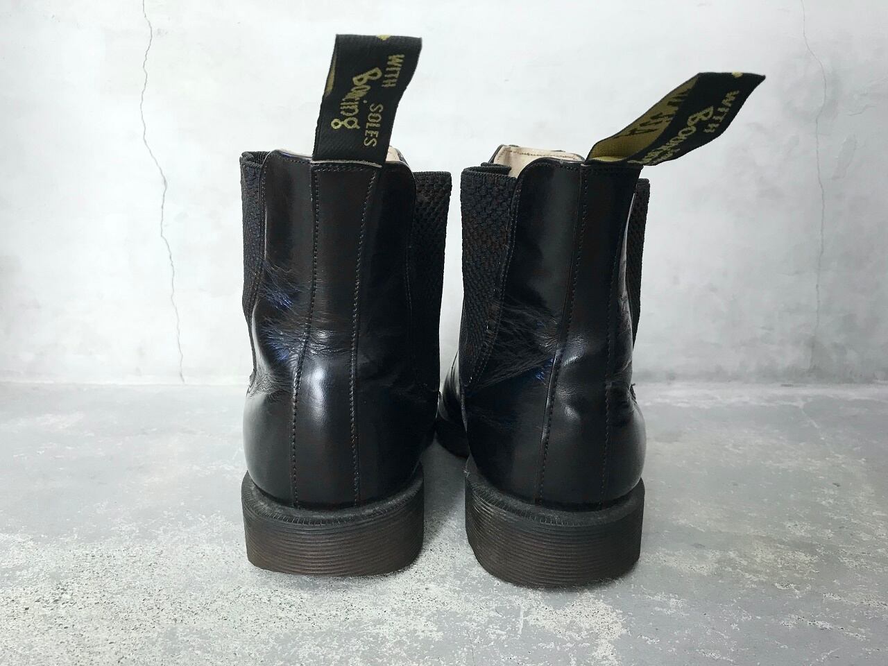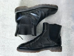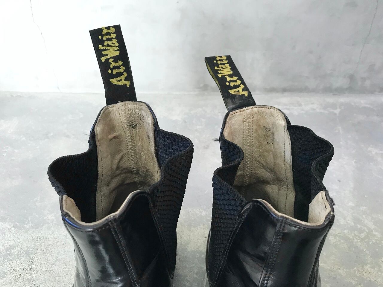 ソールはエアークッションに定評があるAir Wair社で、イエローステッチ無しのMADE IN ENGLAND。シューレース付きのブーツと比べて脱着しやすく、ステッチ無しのプレーンウェルトモデルは足元をよりスタイリッシュですっきりとした雰囲気に。サイドゴムの伸びや全体的な経年変化が見られますが、味のあるドクターマーチンをお探しの方は是非◎