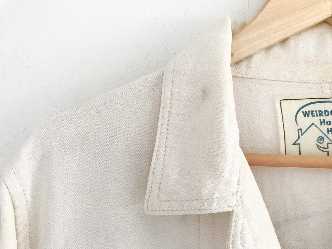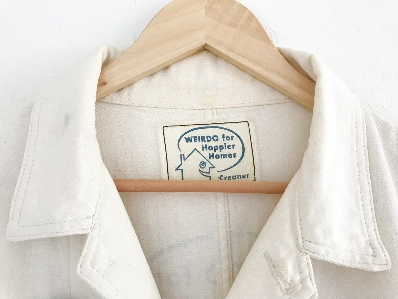 ヘリンボーン調のしっかりとしたコットン生地を使用し、ヴィンテージワークウェアをサンプリングしたロング丈コート。胸のバッジや背面プリントなど、ウィアードらしいタッチで描かれたどこか愛嬌のあるデザインには、ノスタルジックなカスタムカルチャーの雰囲気が惜しみなく表現されています。またアイボリーカラーをベースとした落ち着いた佇まいで、着こむ程に味が出る経年変化を楽しめる所も魅力です。春秋シーズンには主役級のライトアウターとして活躍してくれるウィアードのこだわりが詰まったアイテムです◎