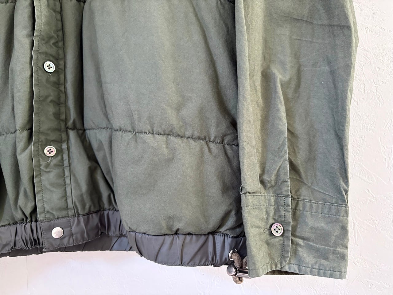 "日常の上に成り立つデザイン"をコンセプトとし、デザイナー・阿部千登勢氏により1999年に設立されたサカイ。独特のシルエットや異素材を組み合わせたデザインが特徴で、クラシックかつエレガントな佇まいが印象的。袖を除いたボディに中綿を備え、シャツのようなフロントボタンや襟など細部のパターンにメリハリをつける事でシャツとジャケットの要素を合わせ持ったユニークなデザインとなっています。また裾はドローコードの絞り付きで、コットンとポリエステル素材を採用した暖かく軽量な着心地も魅力です。