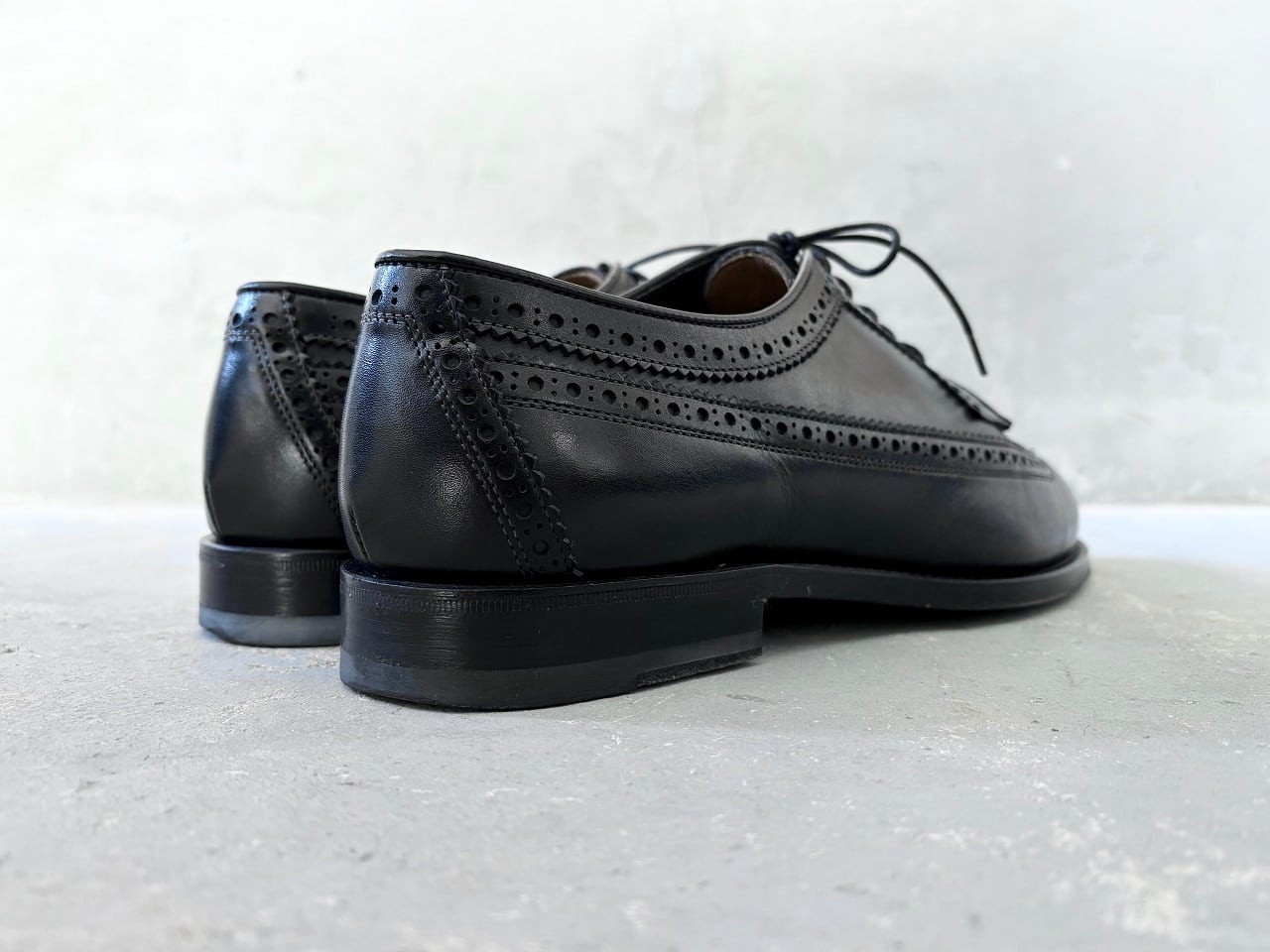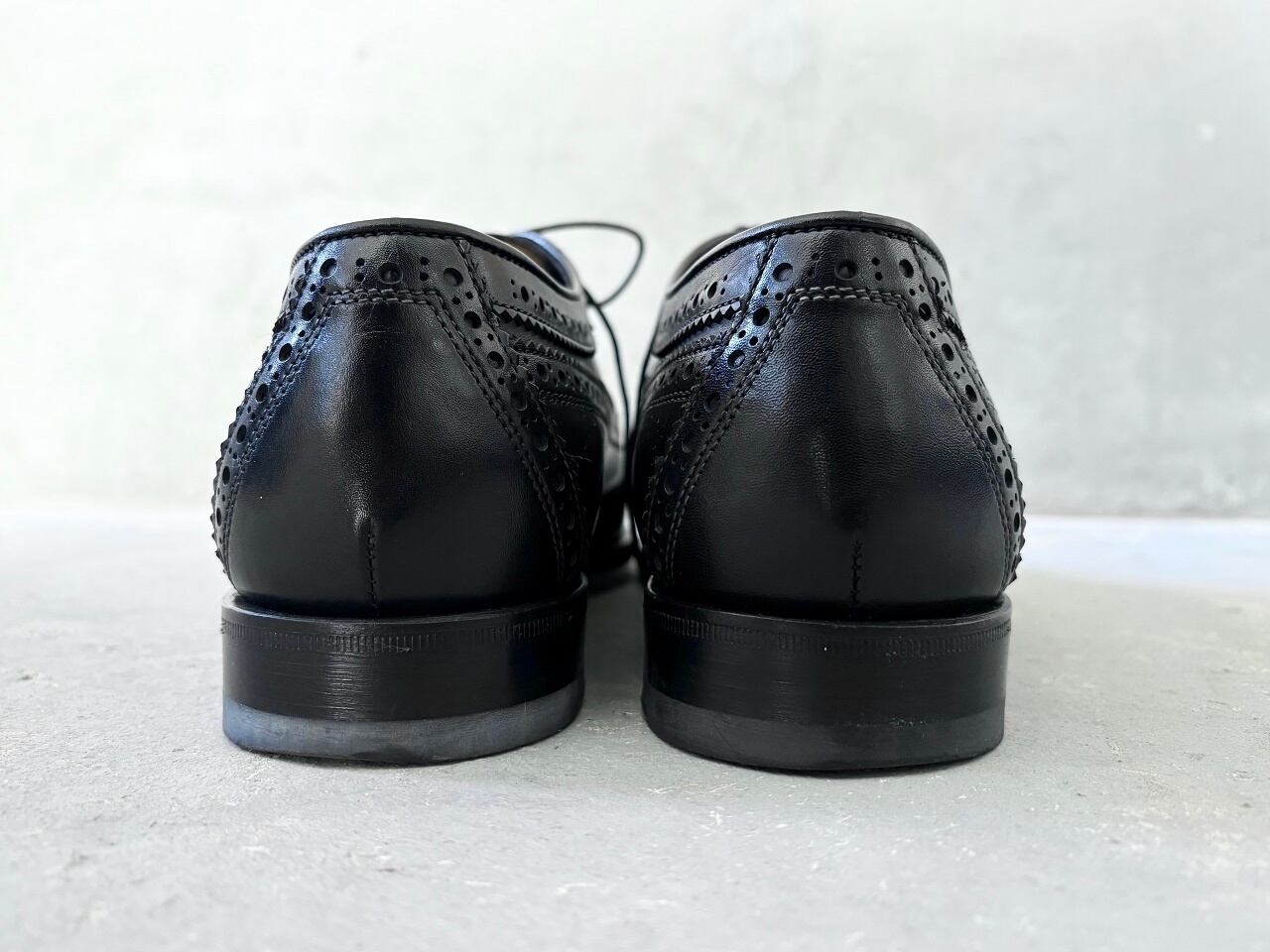 1975年創業のイタリア発レザーシューズブランド、サントーニ。歴史は50年弱とそれほど長くないものの、10種類以上に及ぶ技法を使い分ける巧みな職人技と選び抜かれた素材選び、手作業による徹底した仕上げなど妥協を許さないスタンスでトップブランドへと成長し、イタリアを代表するシューズブランドの一つとして知られています。中でもアッパーとインソールを縫合するグッドイヤー製法は膨大な作業工程を必要とし、サントーニが誇る熟練職人の技が込められています。アッパーは高級感のあるブラックレザーをベースとしたフルブローグ仕様で、コンスタントかつ丁寧なメンテナンスを続けることで味のある深みを増ましていくレザーシューズです。