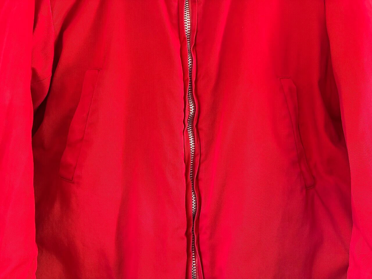 ブランドタグ欠損のため詳細は不明ですが、表面バッファローチェックと裏面レッドで構成された重量感のあるフルジップジャケット。英国のライダースジャケットで知られるルイスレザー採用のCLIXジッパーを装備し、ナイロン地の切り返しや収納式フード、貫通式サイドポケットなどユニークなディテールが特徴的です。裏面のマジックテープやフードの破れなど経年によるダメージが見られますが、細部にこだわりが見られる稀有な雰囲気を持った一着です。