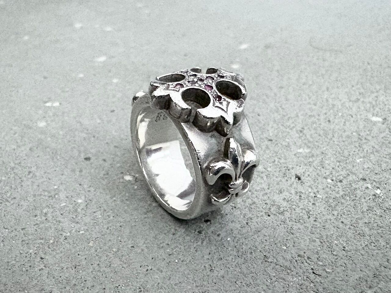 JUSTIN DAVISは2001年創業のシルバージュエリーブランド。ジャパンクオリティの精巧なデザインワークを得意とし、独創的なアート&ロックテイストの世界観をジュエリーで表現。存在感のあるクロスモチーフが中央に鎮座し、サイドには百合の紋章を配した重厚でありながらエレガントな雰囲気が漂うリングです。